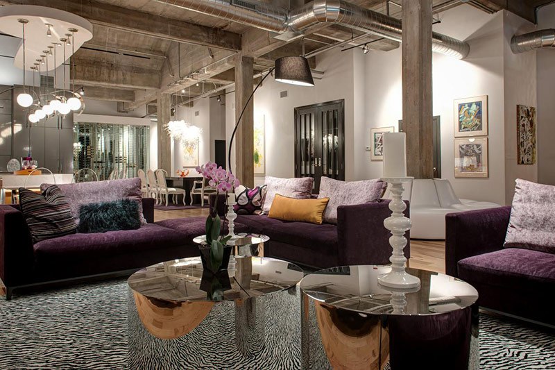 - Loft glamour. La direction est caractérisée par un jeu de couleurs caractéristique. Habituellement, les tons pastel et spectral (gris-lilas, etc.) sont combinés. La décoration mérite une attention particulière - lampadaires, lampes, miroirs, peaux d'animaux ou grandes fleurs en pots.