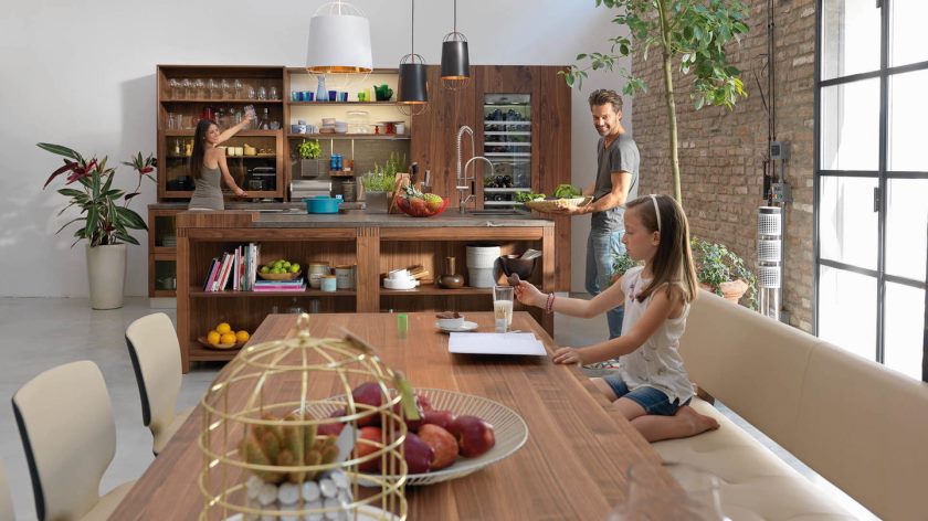 La place principale ici est occupée par les appareils ménagers. Dans le même temps, il convient de veiller à ce que les meubles et les appareils électroménagers, par exemple un réfrigérateur, se combinent bien. Le point culminant de la salle à manger peut être des chaises lumineuses ou un buffet ancien.
