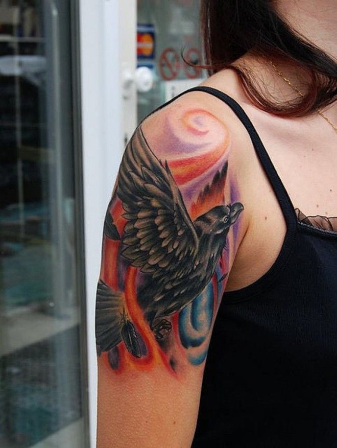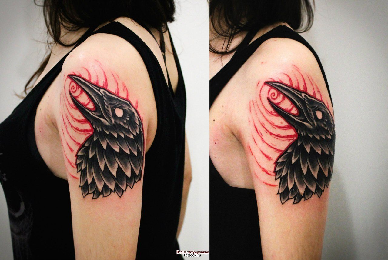 L’image du corbeau est pertinente depuis assez longtemps, car c’est un oiseau très ambigu, il contient du bien et du mal. D'une part, le corbeau est un symbole de la mort et de l'au-delà, d'autre part, il symbolise le renoncement au monde humain et à la sagesse. Quelle devrait être la promesse du tatouage - vous décidez, le côté sombre ou clair est symbolisé par votre corbeau.