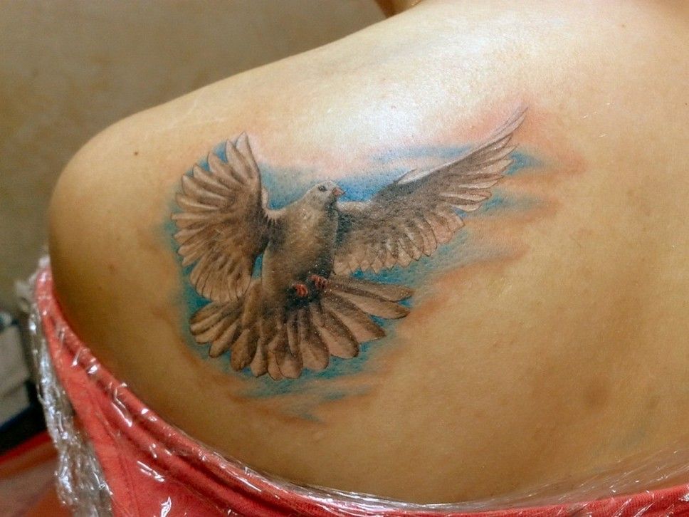 Le tatouage de colombe est souvent utilisé comme souvenir d'un être cher qui a quitté ce monde, le représentant sous la forme d'un oiseau volant aux ailes déployées, comme symbole de l'âme aspirant au ciel.