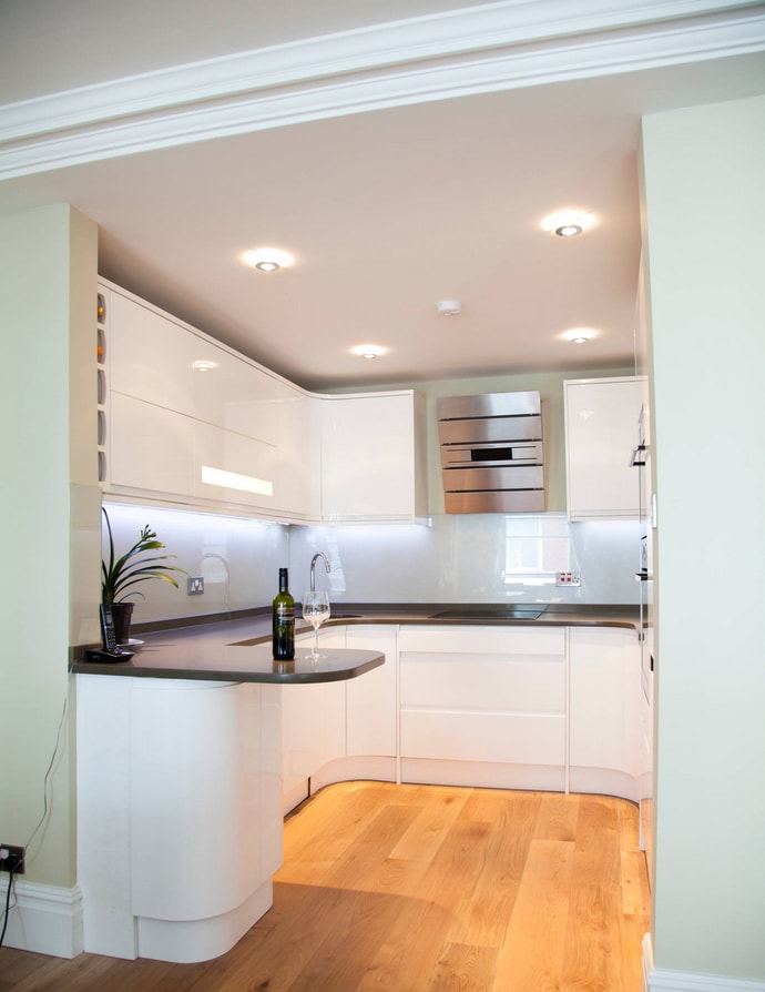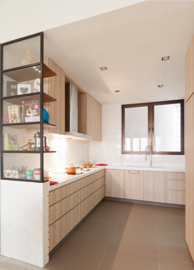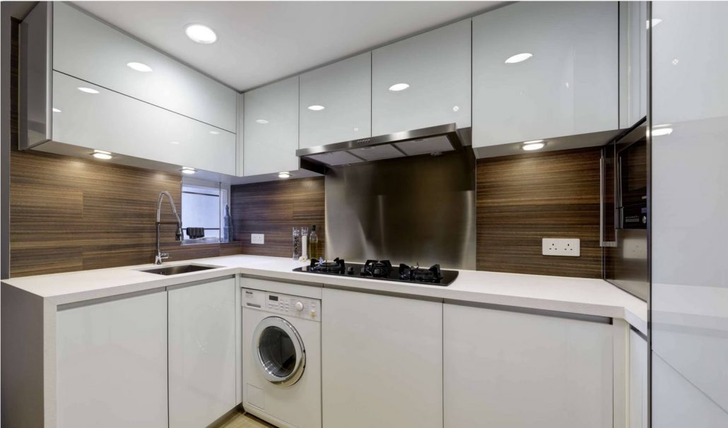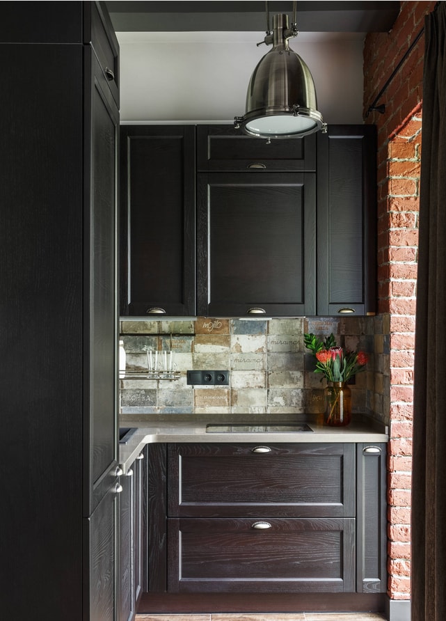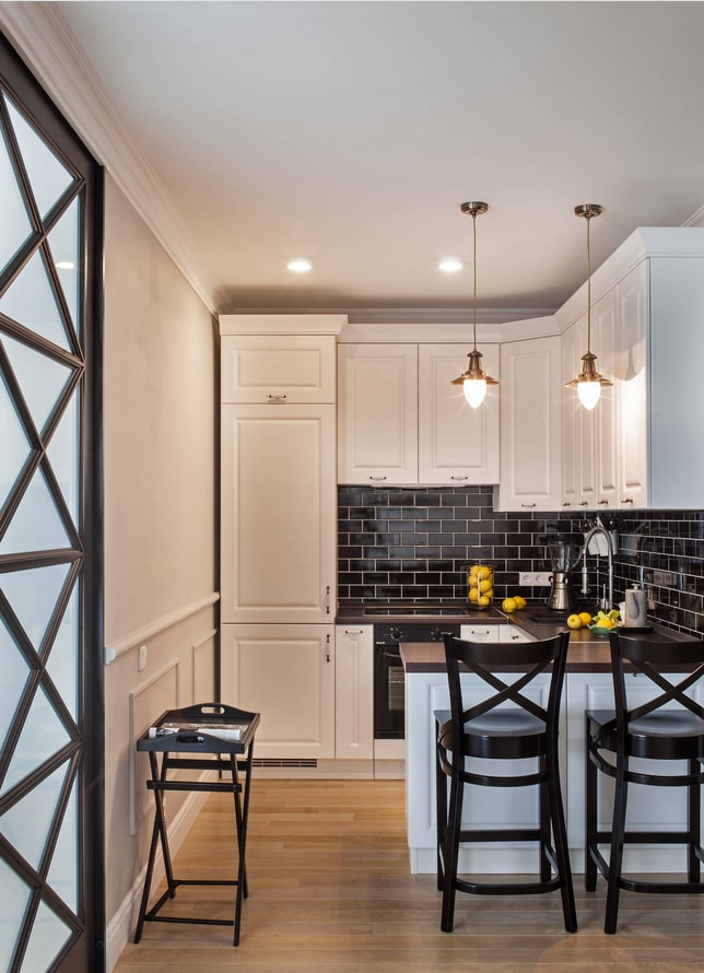 L'éclairage devrait être adéquat. Par conséquent, vous devriez penser à des lumières supplémentaires à l'avance s'il y a une petite fenêtre dans la cuisine. Pour économiser de l'espace, les portes peuvent être faites coulissantes.