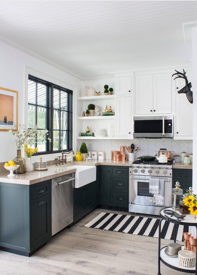 La disposition correcte des meubles dans la cuisine est un aspect tout aussi important. Il doit être en forme de L ou linéaire. N'utilisez pas de disposition à deux lignes, en forme de U et d'îlot.