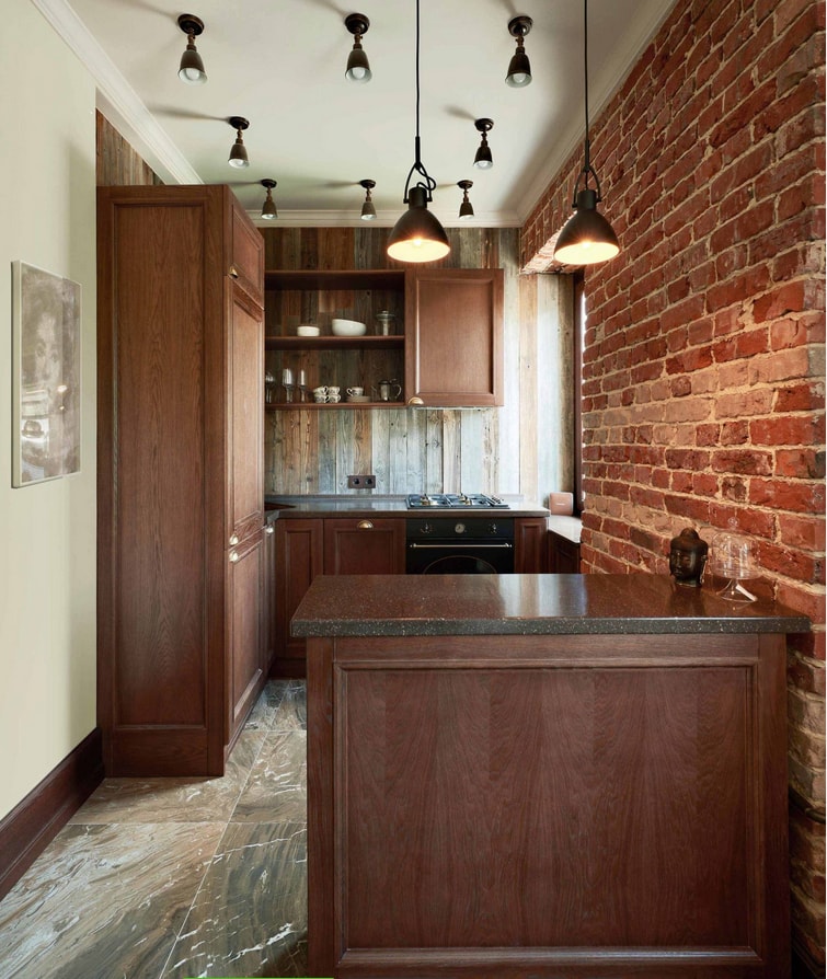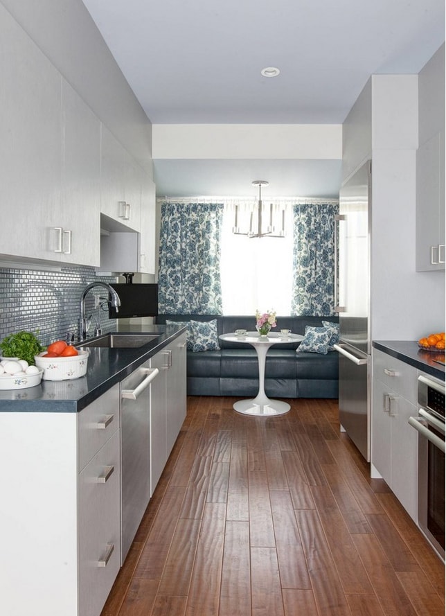Avec une forme rectangulaire de la cuisine, il est préférable d’installer les meubles le long des murs. Un bar est préférable de remplacer la table à manger. Pour augmenter visuellement le volume d’une petite cuisine, vous devez accrocher un grand miroir au mur et il est préférable de choisir des rideaux avec un grand motif.