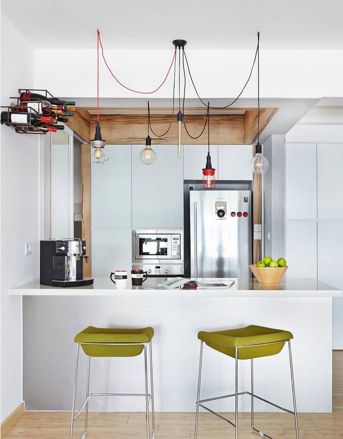 Sur la surface de travail de la cuisine doivent être placés les appareils électriques les plus couramment utilisés - cafetière, bouilloire électrique. Le reste peut être caché dans des armoires hautes avec des niches. Et si nécessaire, ils seront faciles à obtenir.
