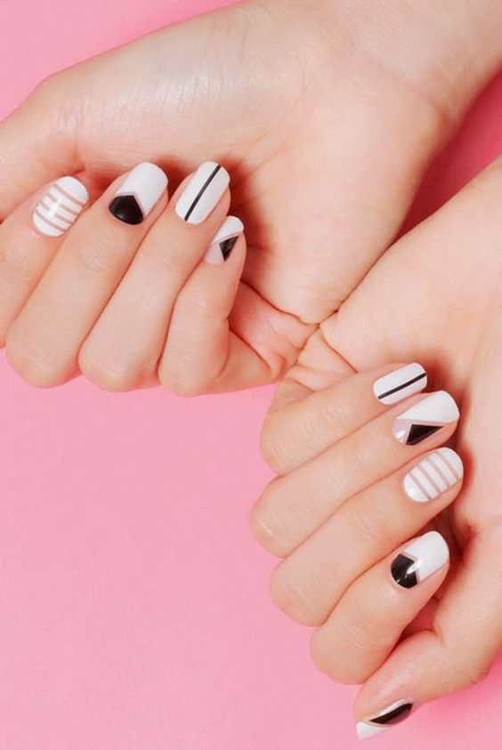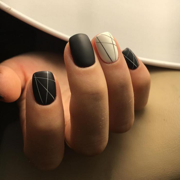 Un vrai succès était une manucure géométrique en noir et blanc. Il est incroyablement beau, élégant et moderne. En outre, il est souvent complété par l'image de grandes feuilles vertes et d'autres dessins. C'est une bonne idée de faire une manucure moins stricte et de lui donner une touche de fraîcheur.