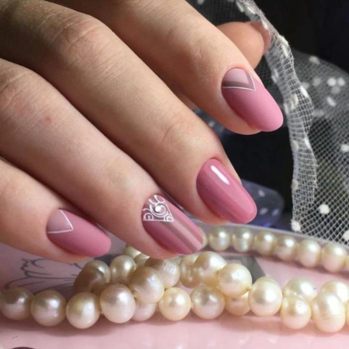 Une combinaison très inhabituelle dans un design est un motif géométrique et lunaire. C'est une solution moderne qui met au second plan les types classiques de manucure. D'accord, la combinaison de deux dessins stylisés dans un même dessin semble beaucoup plus intéressante. Néanmoins, nous notons qu'il peut être difficile de le mettre en œuvre à la maison. Pour ce faire, vous devez d'abord marquer et ensuite procéder à la conception des ongles.