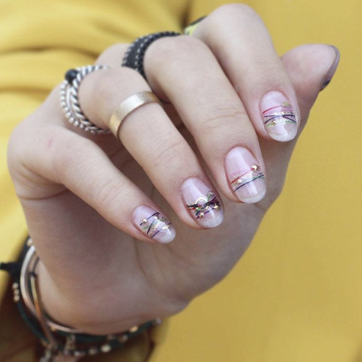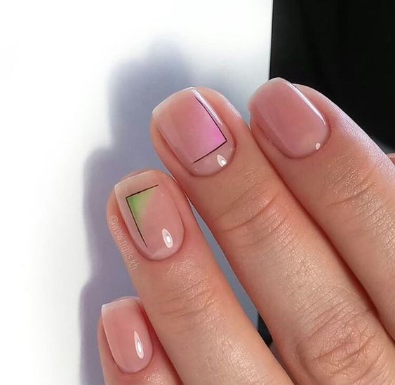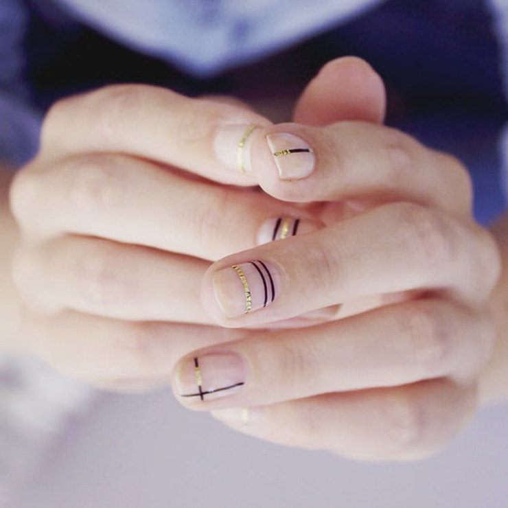 Pour ceux qui n'aiment pas les dessins trop vifs et riches en détails, nous vous recommandons de faire attention à une excellente alternative: une conception géométrique dans le style du minimalisme. Un vernis transparent est souvent utilisé, ce qui constitue une base certaine pour la création de dessins en couleur. Il a toujours l’air attrayant, alors préparez-vous au fait que les ongles ne resteront pas sans attention.