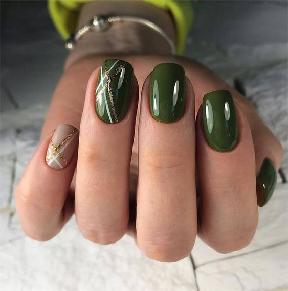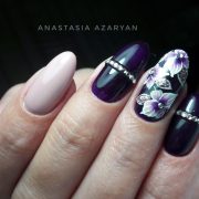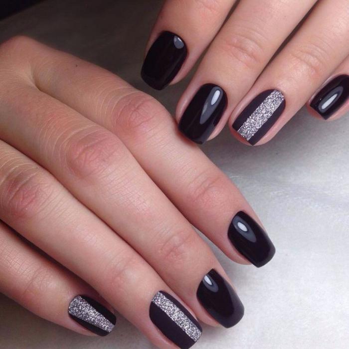 La conception géométrique n'est pas moins pertinente, ce qui suggère la présence d'une bande longitudinale sur l'annulaire. Dans ce cas, vous pouvez utiliser la technique, grâce à laquelle la figure sera complètement différente. Par exemple, une bande de strass ou de papier d'aluminium, de sable - une excellente alternative à une simple option peinte. Alors n'hésitez pas à expérimenter et essayer de nouvelles options.
