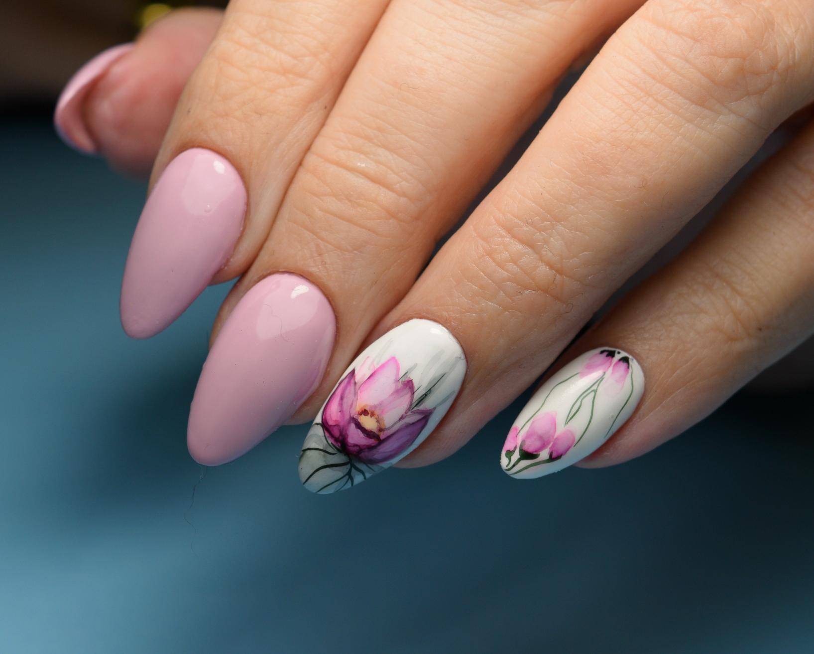 Manucure aquarelle avec des fleurs.