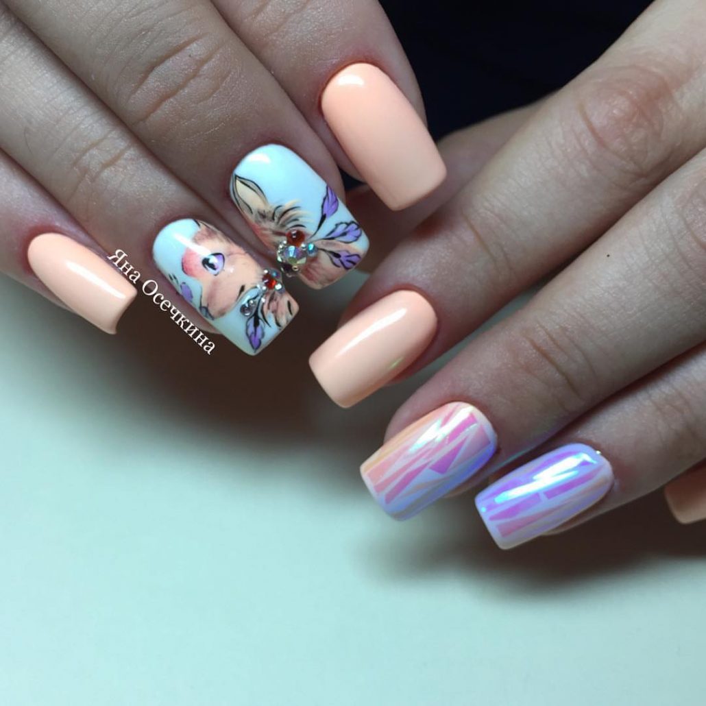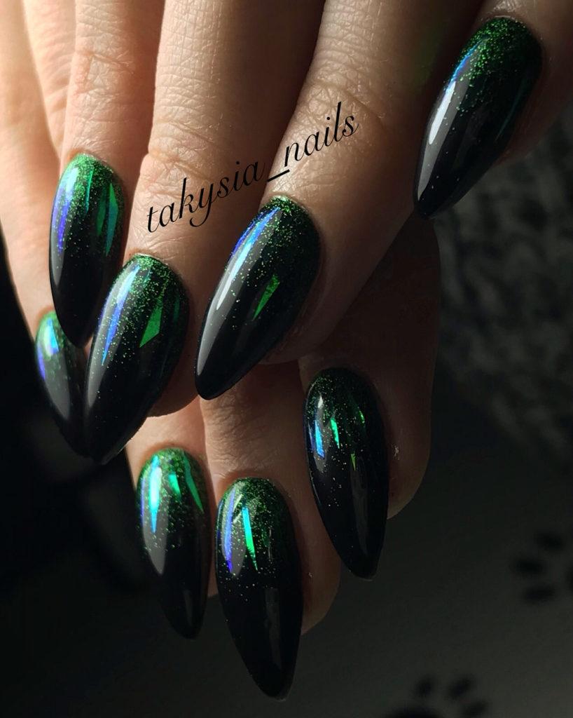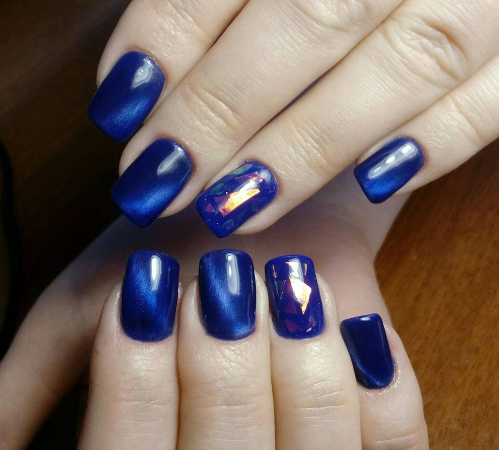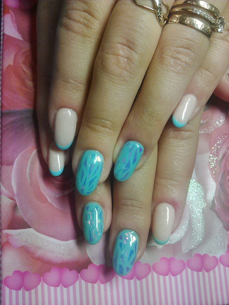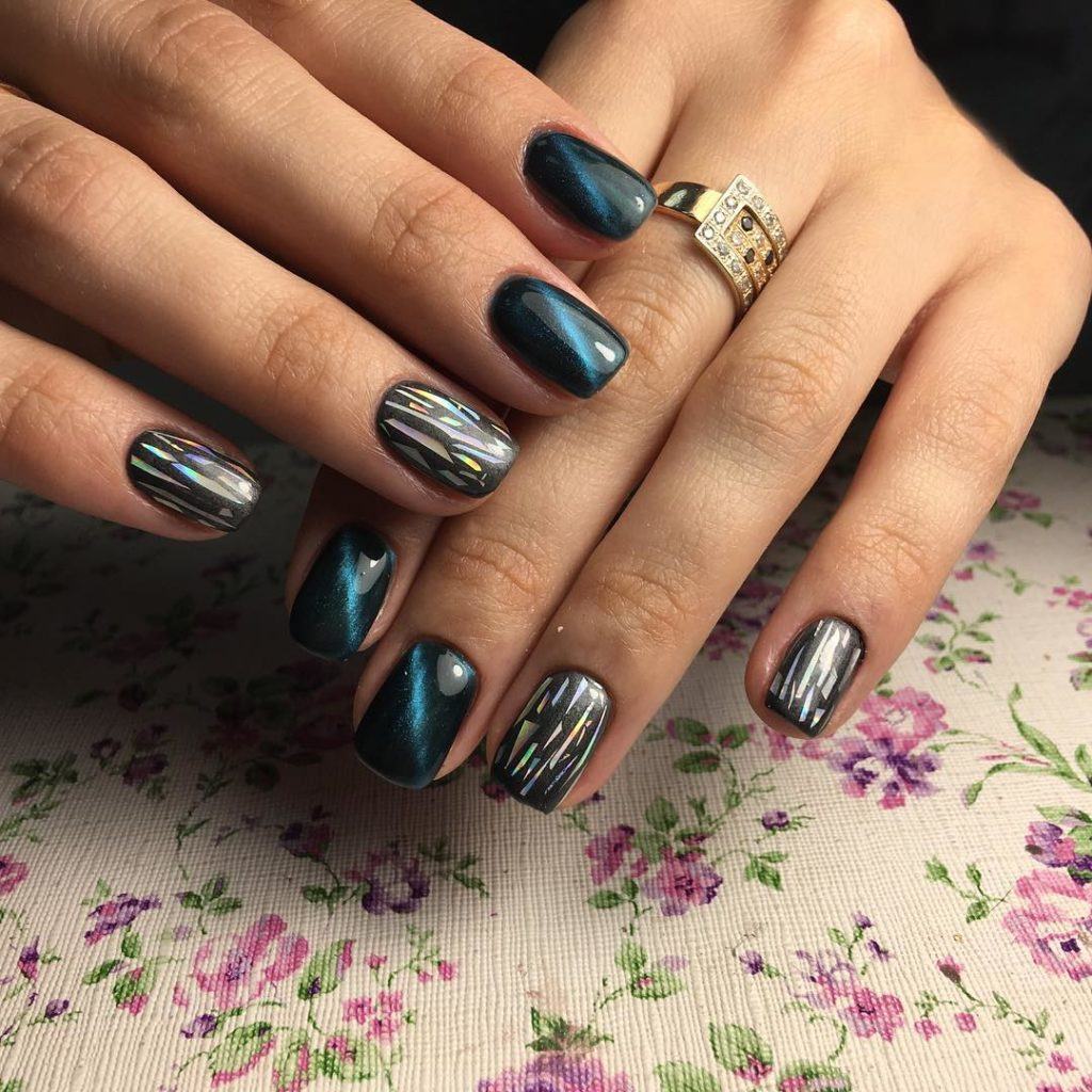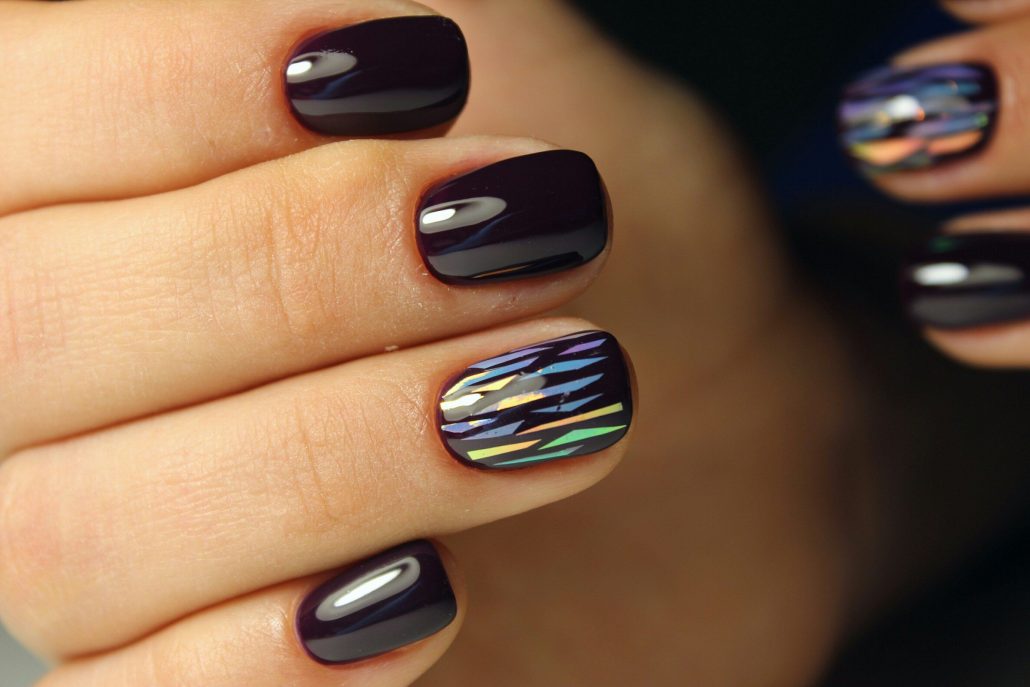 Une manucure réalisée selon cette technique est constituée de morceaux de feuille holographique appliqués sur une plaque à ongles dans un ordre aléatoire ou sous la forme d’un motif spécifique. La gamme de couleurs de ce type de matériau est suffisamment large pour vous permettre de concrétiser vos idées les plus audacieuses et fantastiques.