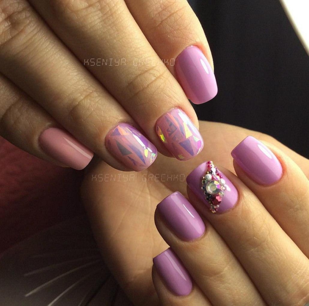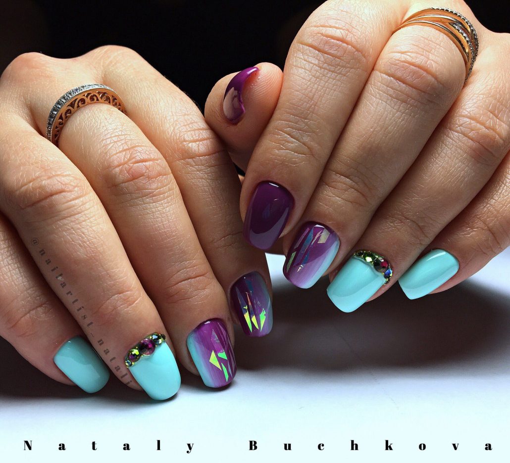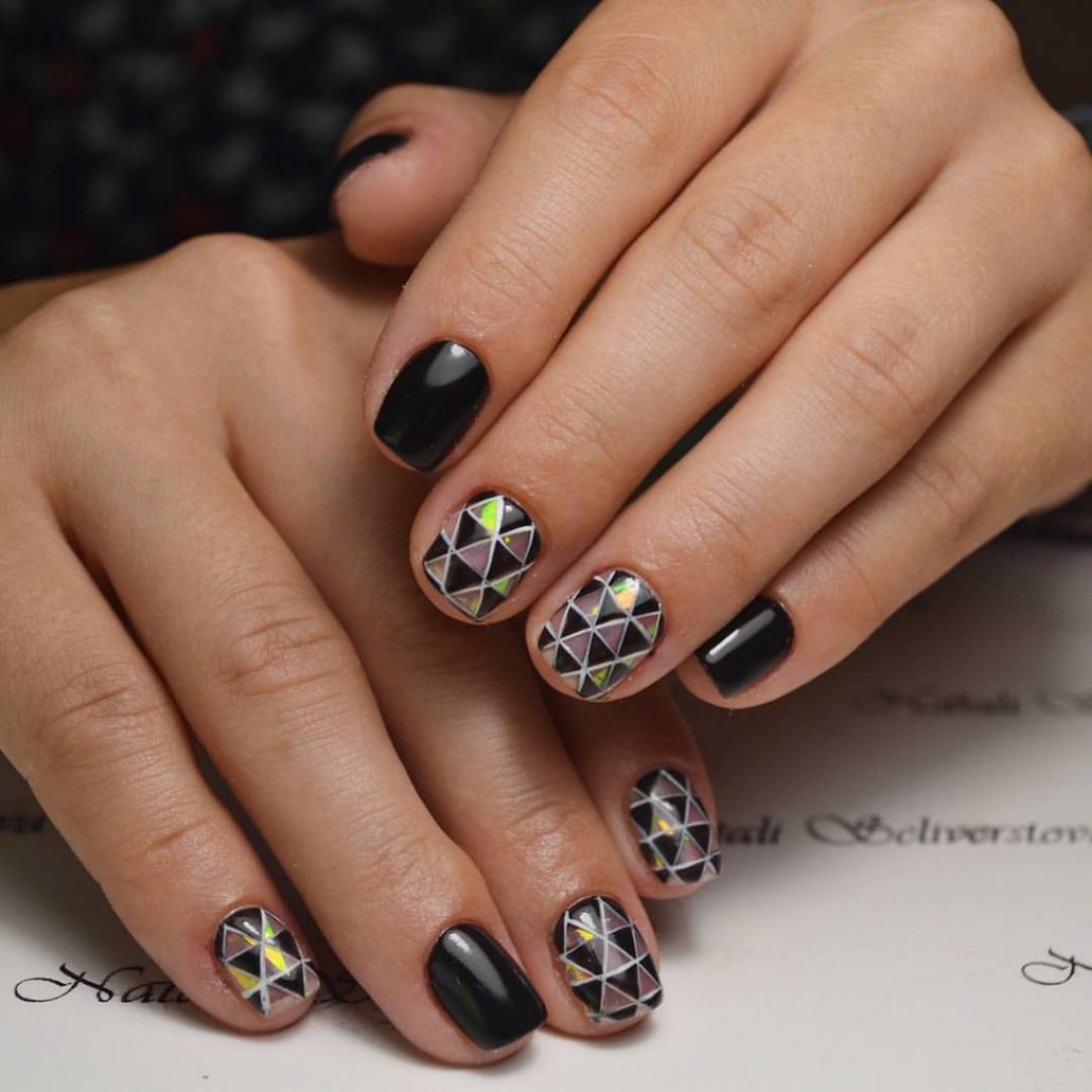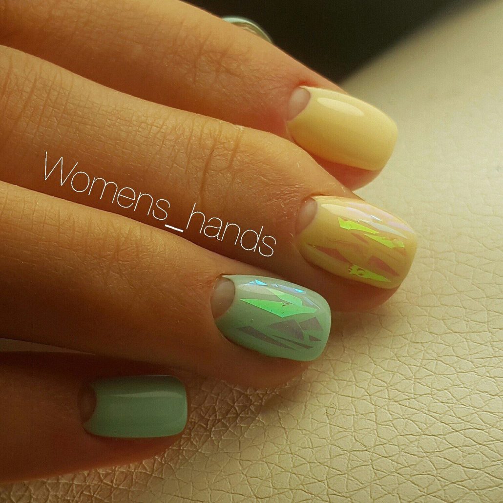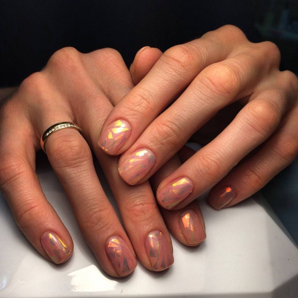 L'effet de scintillement sur les ongles est possible en raison de la réflexion des rayons lumineux provenant du matériau utilisé. Extérieurement, cela ressemble à un kaléidoscope. Par conséquent, la conception de «verre brisé» est particulièrement recherchée par les fans du style fantastique. Une telle conception sera particulièrement populaire en été, car l'abondance de lumière attirera l'attention des autres autour d'elle.