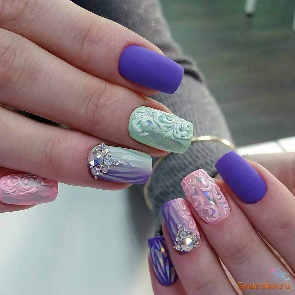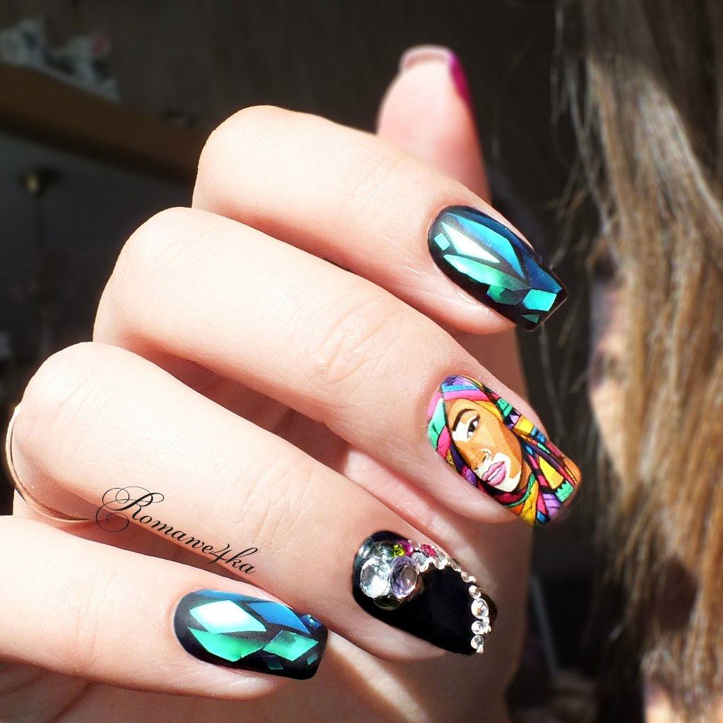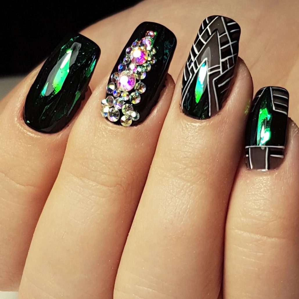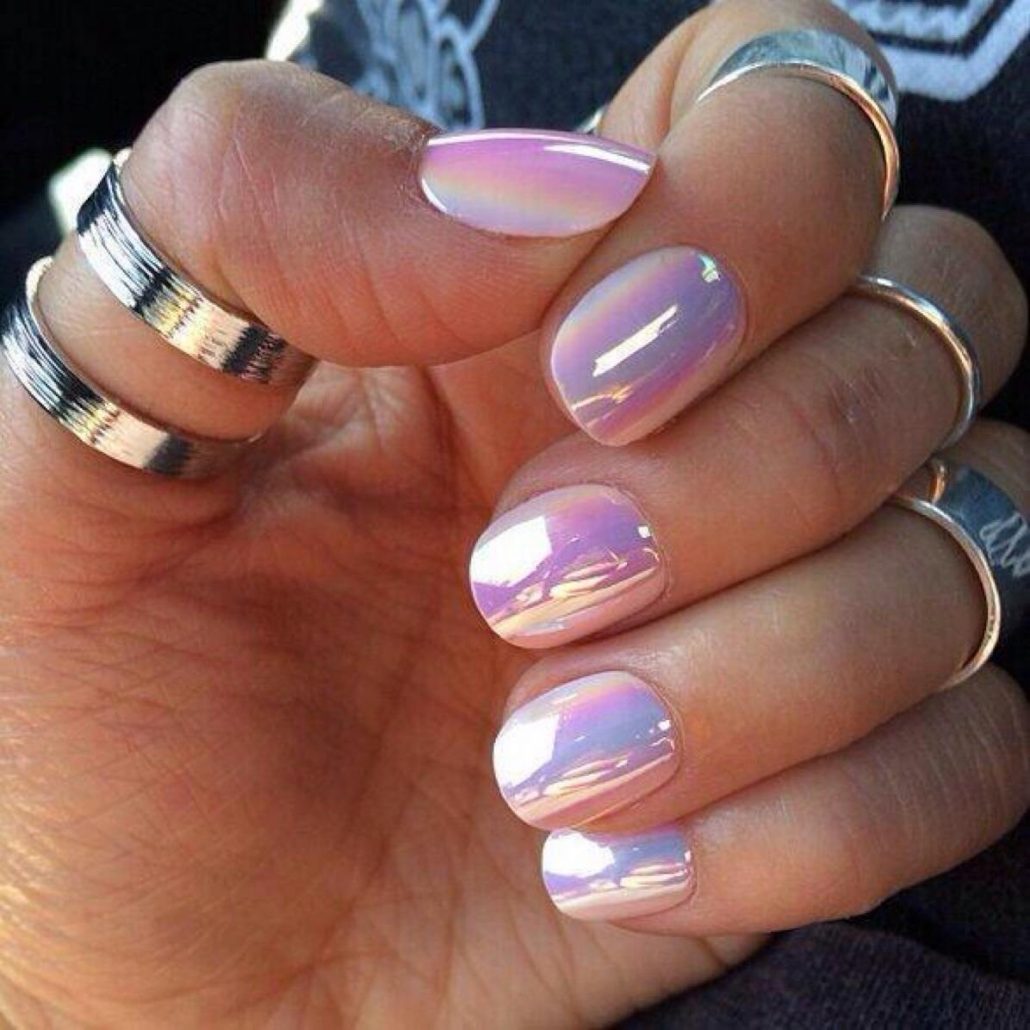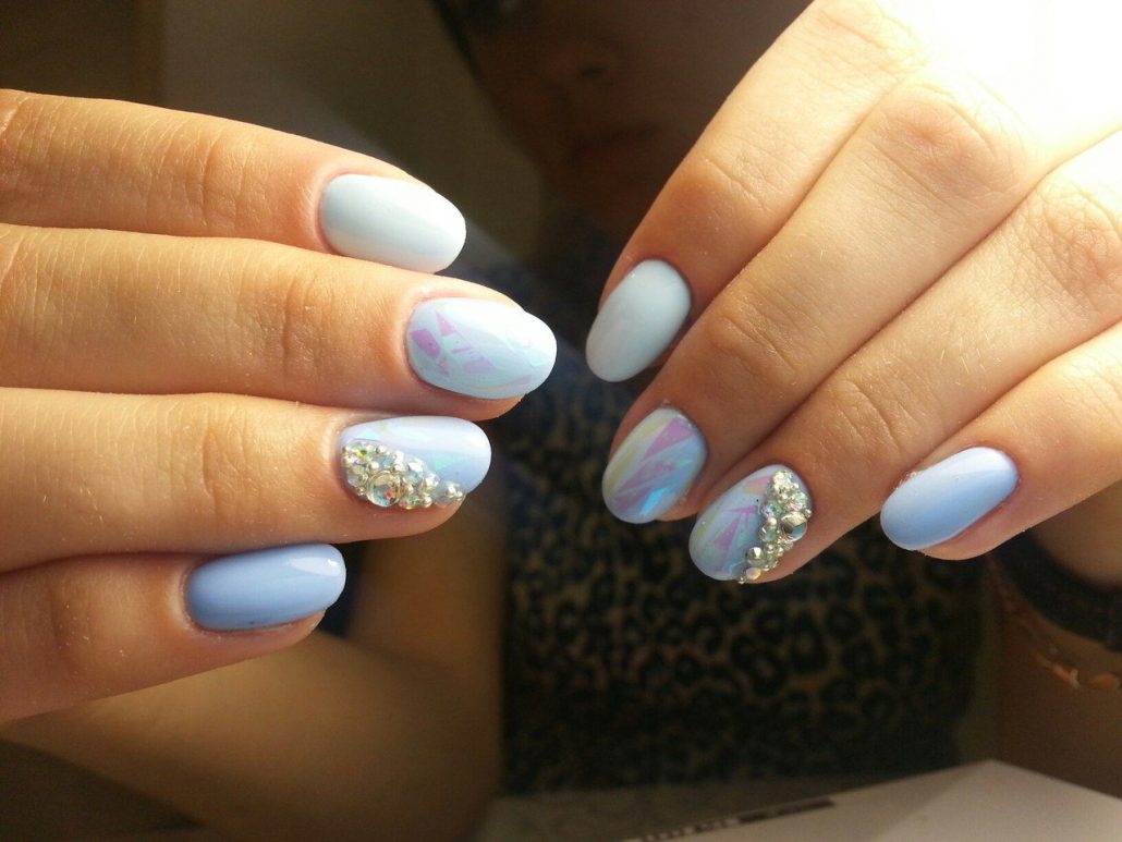 L'effet de scintillement sur les ongles est possible en raison de la réflexion des rayons lumineux provenant du matériau utilisé. Extérieurement, cela ressemble à un kaléidoscope. Par conséquent, la conception de «verre brisé» est particulièrement recherchée par les fans du style fantastique. Une telle conception sera particulièrement populaire en été, car l'abondance de lumière attirera l'attention des autres autour d'elle.