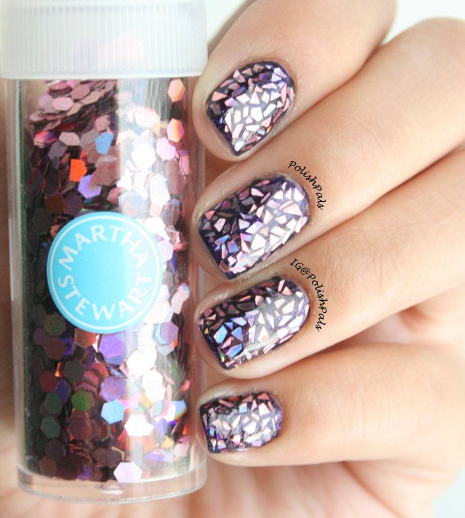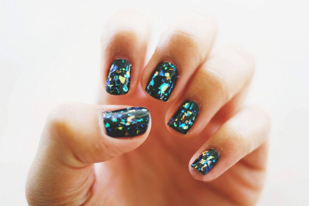 Les éclats peuvent être appliqués sur un revêtement de couleur ou simplement sur un vernis incolore. En tout cas, le design est original.