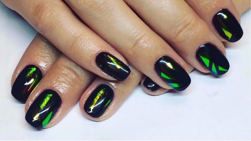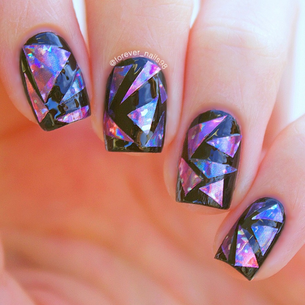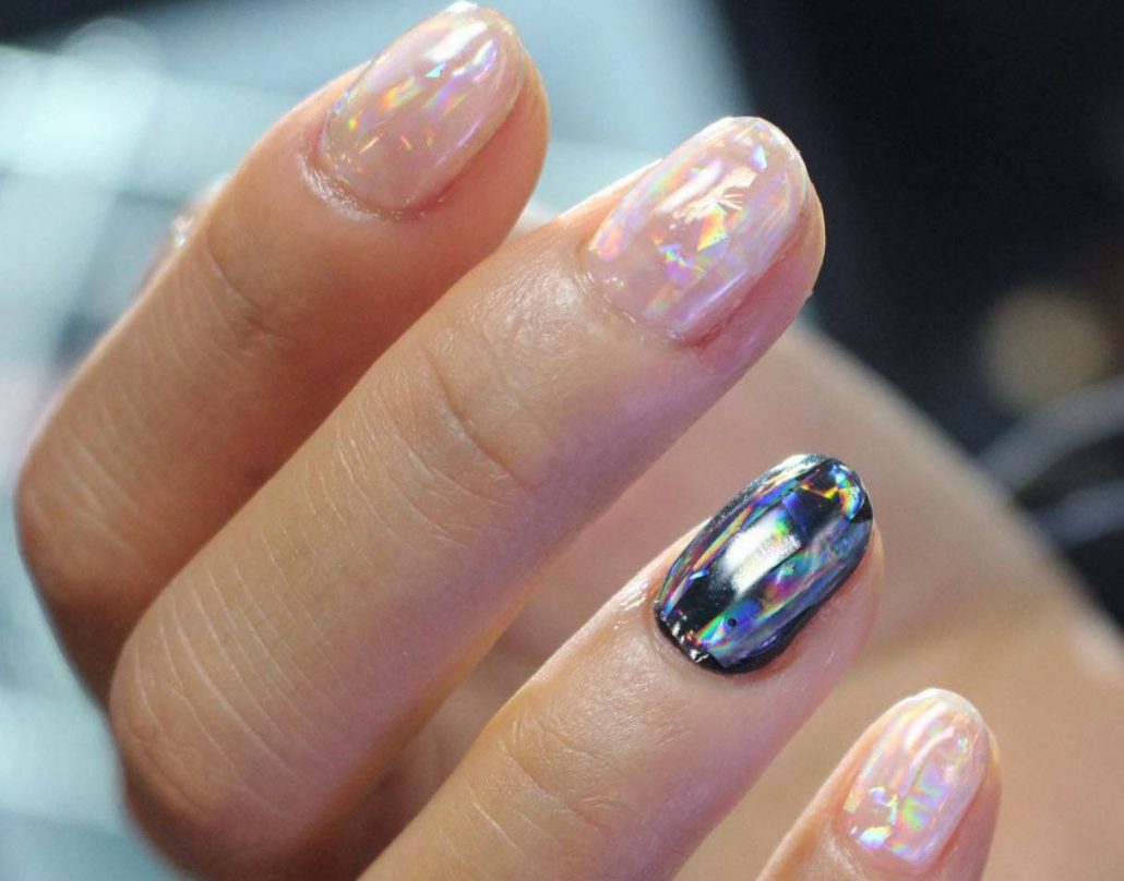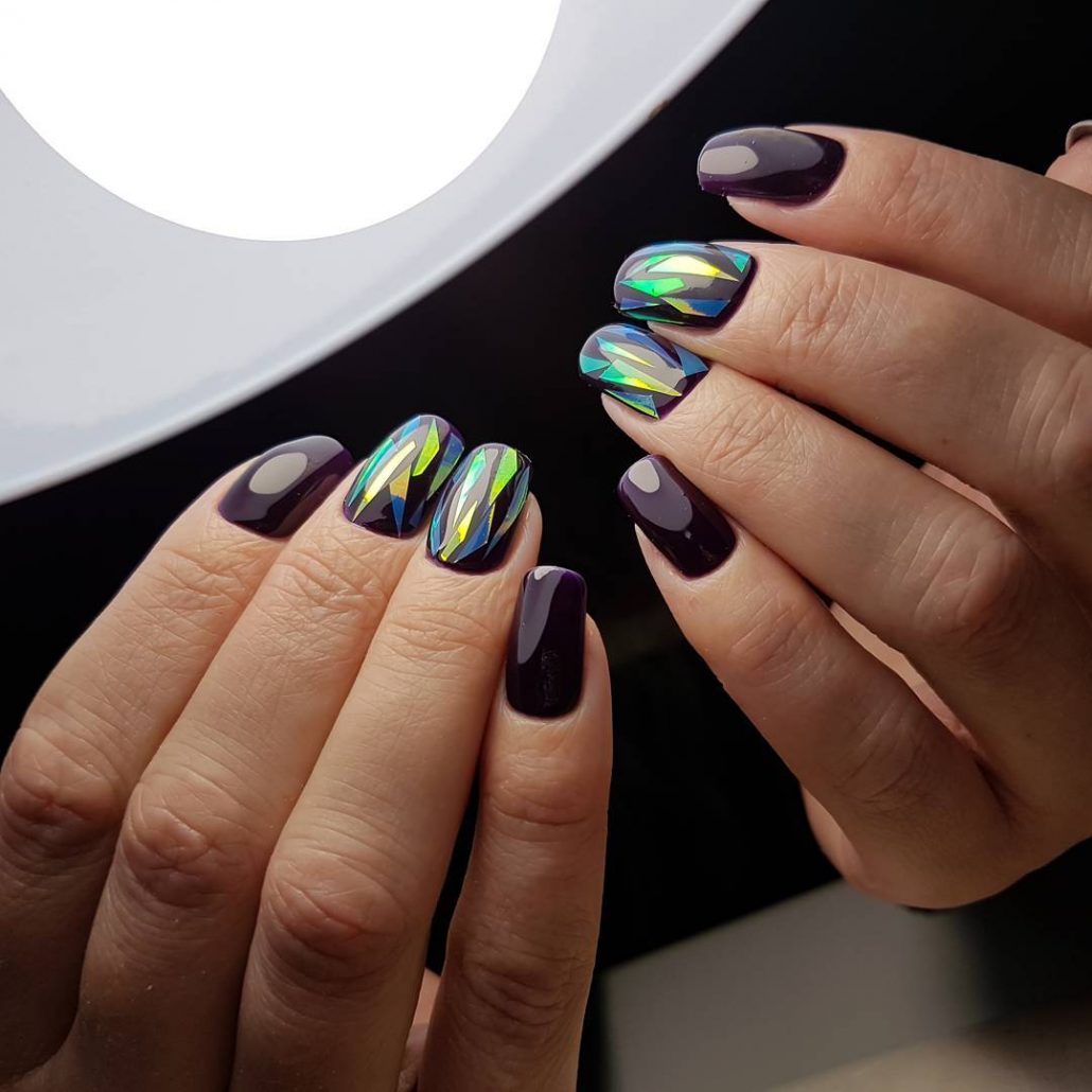 Pour la manucure, appelée «verre brisé», on utilise un film holographique spécial dont des morceaux sont appliqués sur la plaque à ongles. La lumière incidente sur ces pièces est réfractée, créant un débordement spectaculaire et un jeu de couleurs sur les ongles, qui ne peuvent tout simplement pas vous laisser sans surveillance.