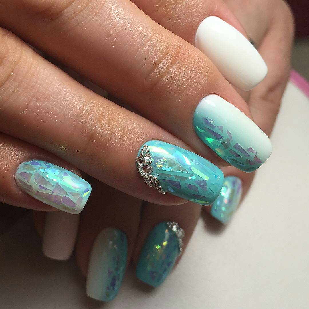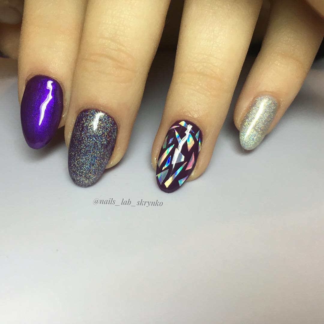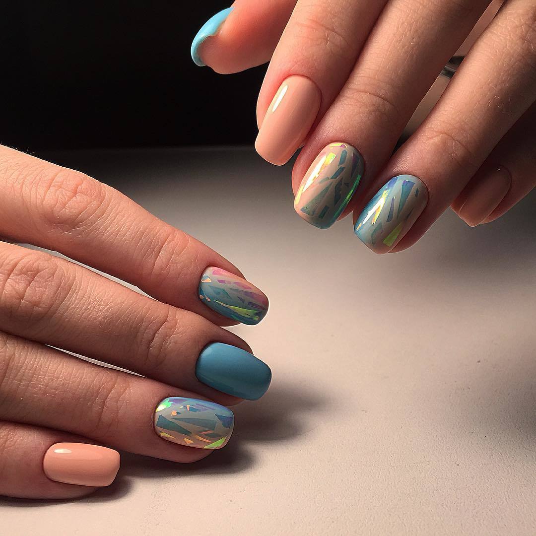 L'effet de scintillement sur les ongles est possible en raison de la réflexion des rayons lumineux provenant du matériau utilisé. Extérieurement, cela ressemble à un kaléidoscope. Par conséquent, la conception de «verre brisé» est particulièrement recherchée par les fans du style fantastique. Une telle conception sera particulièrement populaire en été, car l'abondance de lumière attirera l'attention des autres autour d'elle.