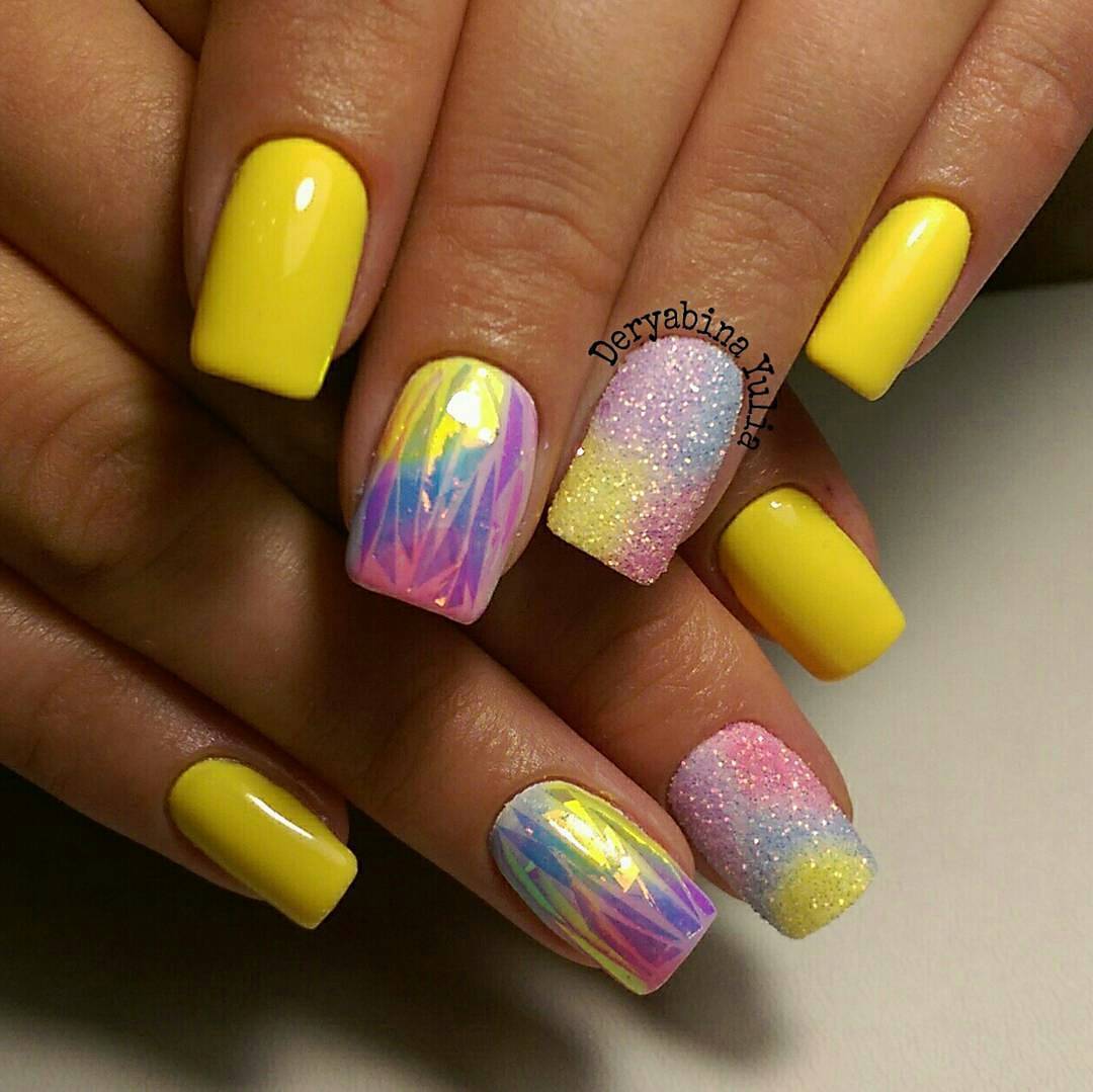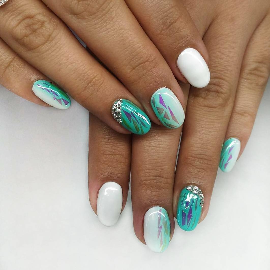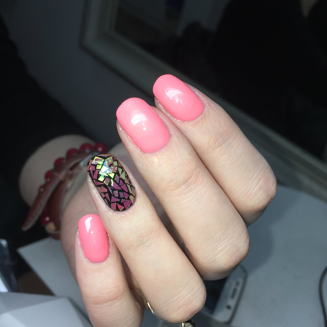 L'effet de scintillement sur les ongles est possible en raison de la réflexion des rayons lumineux provenant du matériau utilisé. Extérieurement, cela ressemble à un kaléidoscope. Par conséquent, la conception de «verre brisé» est particulièrement recherchée par les fans du style fantastique. Une telle conception sera particulièrement populaire en été, car l'abondance de lumière attirera l'attention des autres autour d'elle.