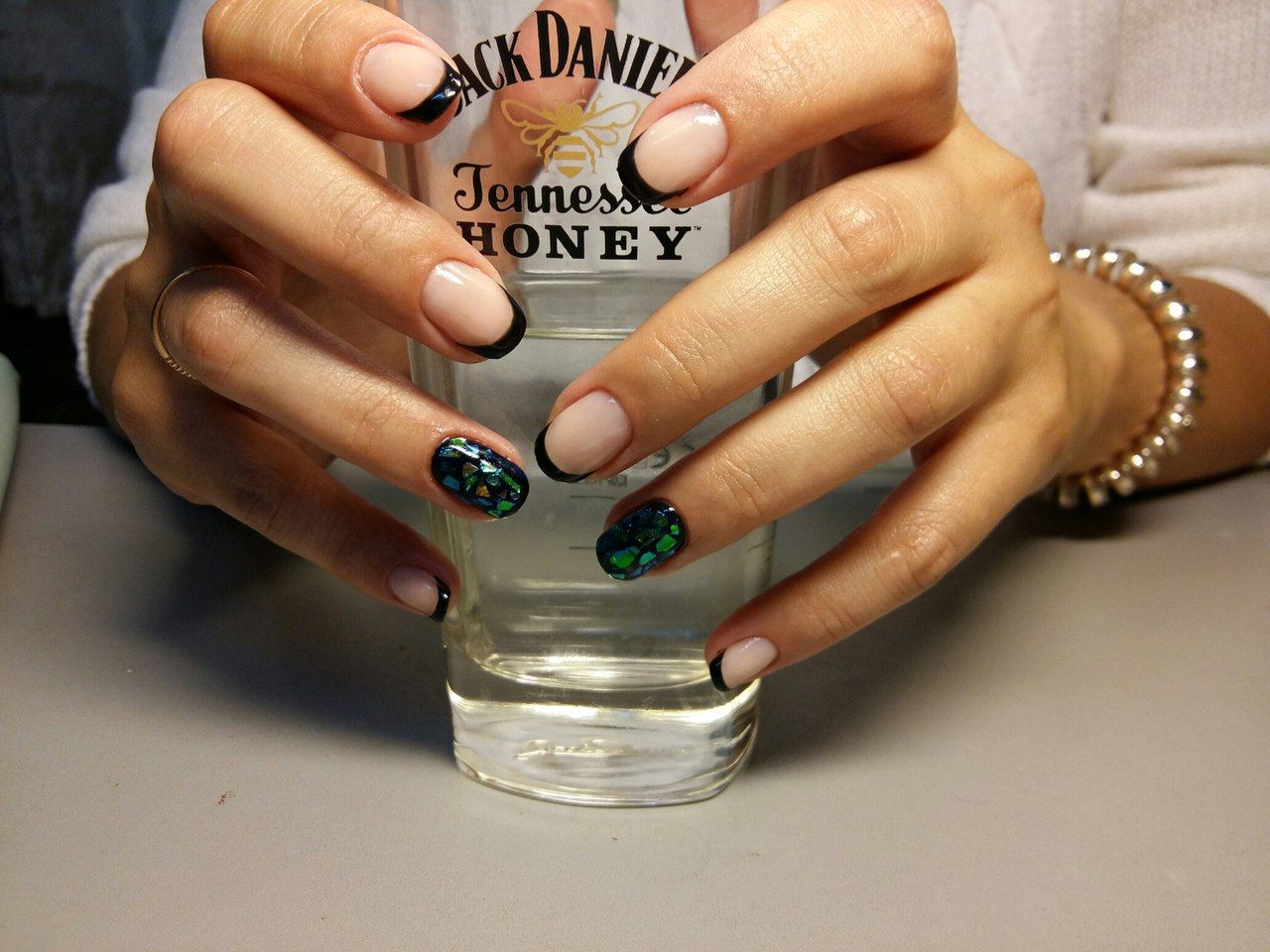 Cela va bien avec manucure au clair de lune. Comme une veste, du verre brisé peut être utilisé pour décorer un trou. Une manucure semble attrayante dans laquelle le trou n'est pas du tout peint ou recouvert d'un vernis incolore, tandis que la plaque à ongles est recouverte de fragments de différentes tailles et formes. Cette conception se distingue par sa praticité, puisque la croissance de l'ongle sera complètement invisible.