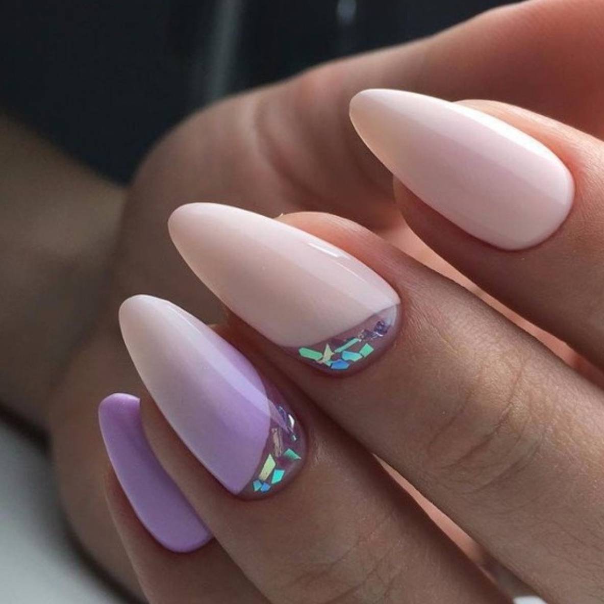 Les éclats peuvent être appliqués sur tous les ongles, mais on ne peut en distinguer que 1 ou 2 accents, le reste étant peint avec du vernis uni. Les natures délicates et romantiques pourront appliquer ces pièces sur un vernis incolore ou un revêtement pastel de manière chaotique.