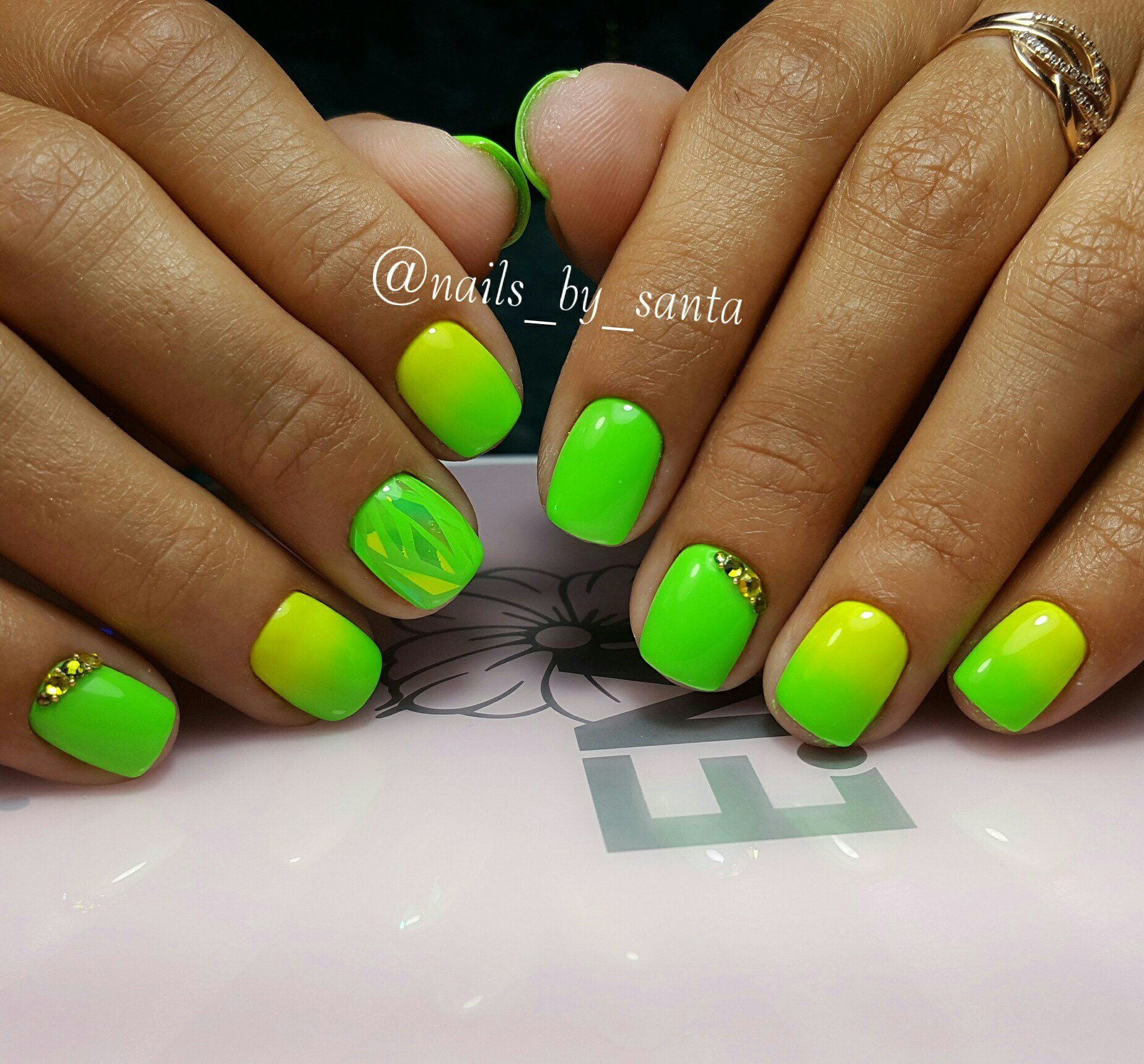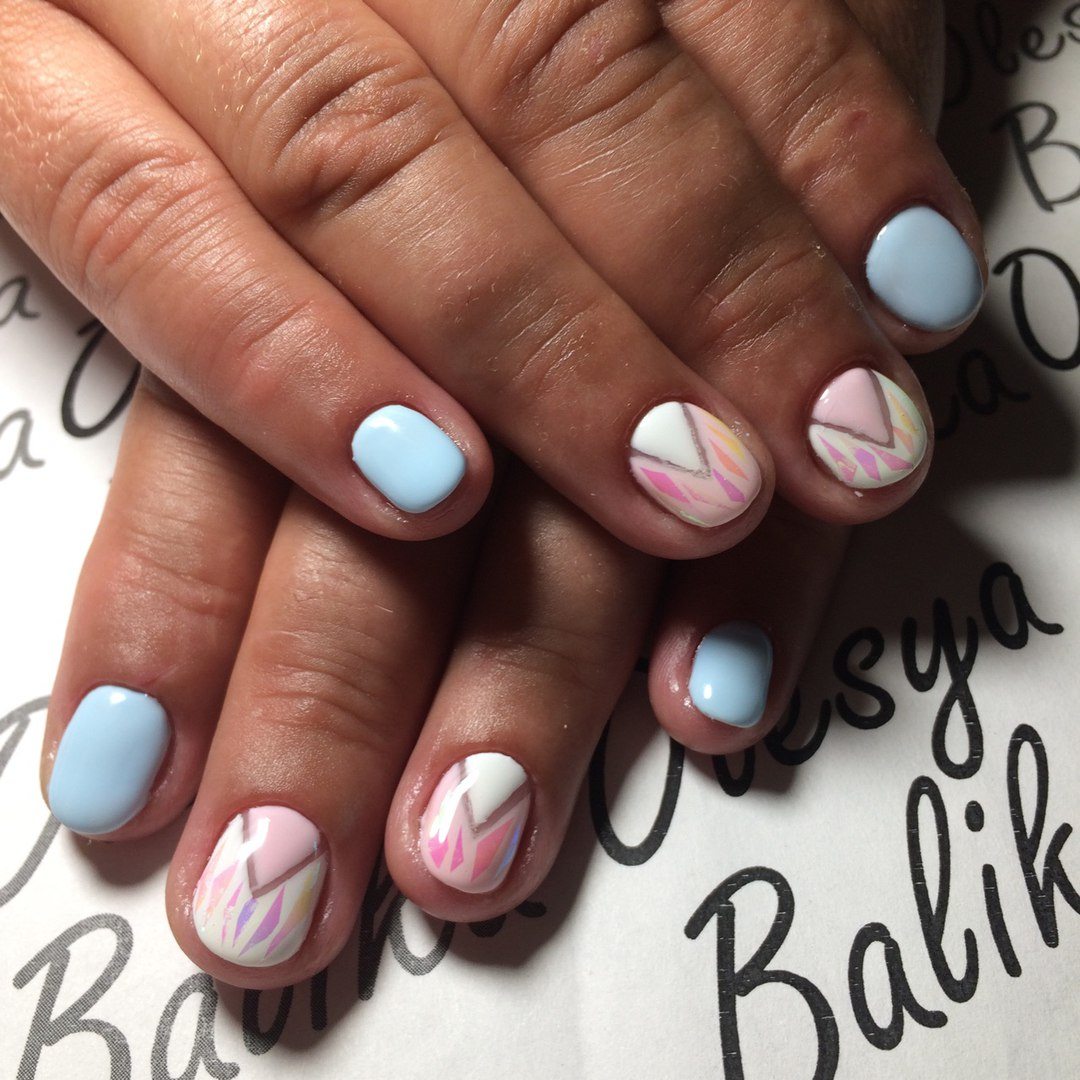 Une manucure réalisée selon cette technique est constituée de morceaux de feuille holographique appliqués sur une plaque à ongles dans un ordre aléatoire ou sous la forme d’un motif spécifique. La gamme de couleurs de ce type de matériau est suffisamment large pour vous permettre de concrétiser vos idées les plus audacieuses et fantastiques.