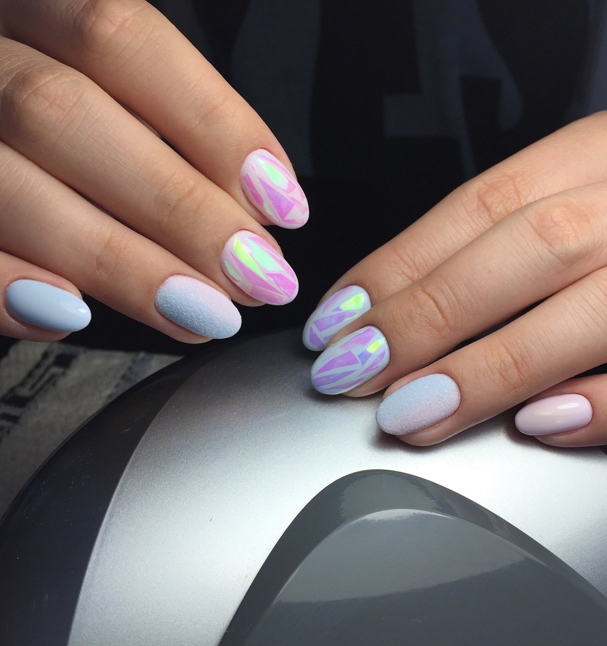 Pour la manucure, appelée «verre brisé», on utilise un film holographique spécial dont des morceaux sont appliqués sur la plaque à ongles. La lumière incidente sur ces pièces est réfractée, créant un débordement spectaculaire et un jeu de couleurs sur les ongles, qui ne peuvent tout simplement pas vous laisser sans surveillance.