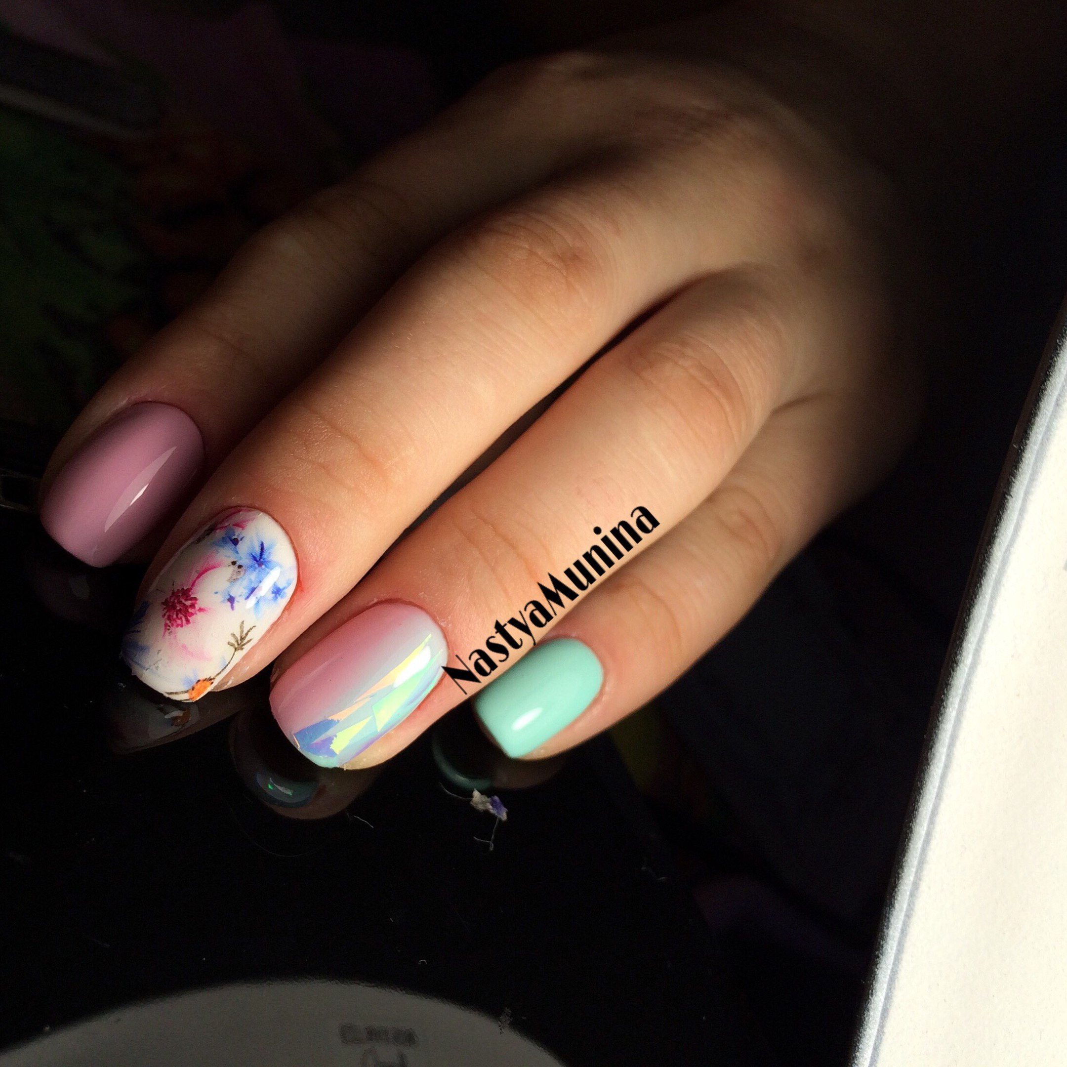 Ceux qui n'ont pas de feuille holographique peuvent utiliser du mica coloré. Une telle manucure est encore plus facile à réaliser, le mica n’ayant pas besoin d’être coupé en morceaux à l’avance. De plus, vous pouvez acheter des autocollants holographiques spéciaux, ce qui accélérera le processus de manucure. Dans les cas extrêmes, vous pouvez utiliser des strass de forme irrégulière, le mica, qui reste d'un bouquet de fleurs ou même d'une enveloppe de chocolat.
