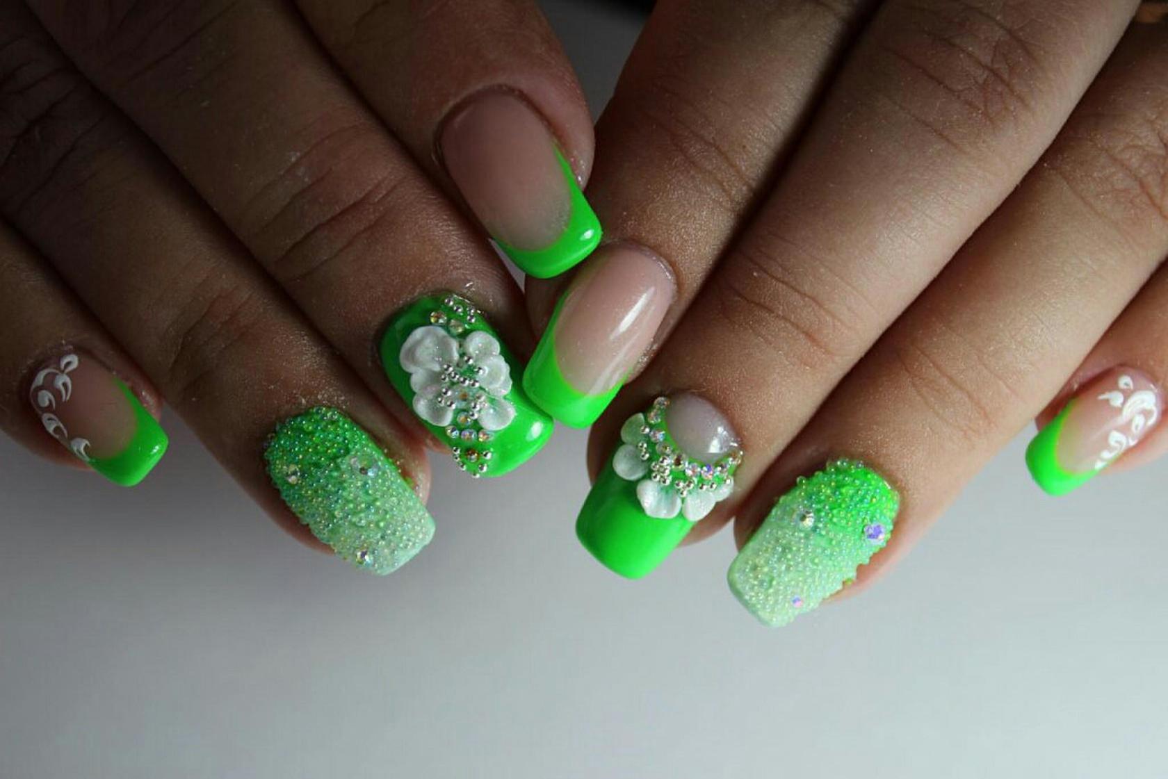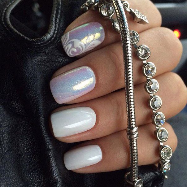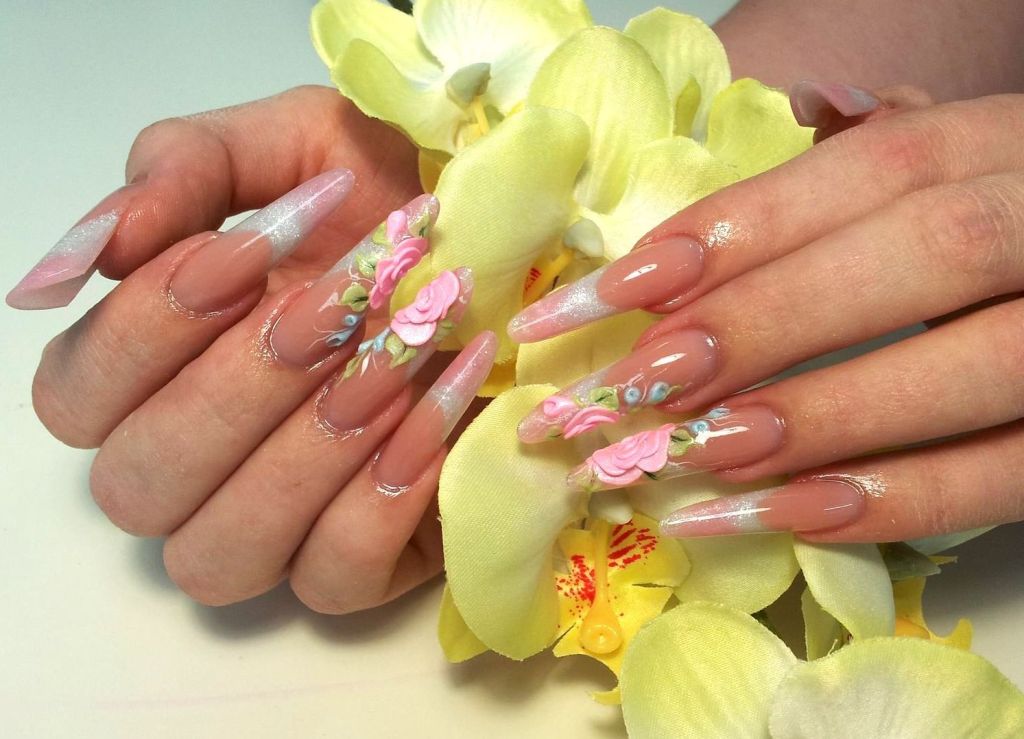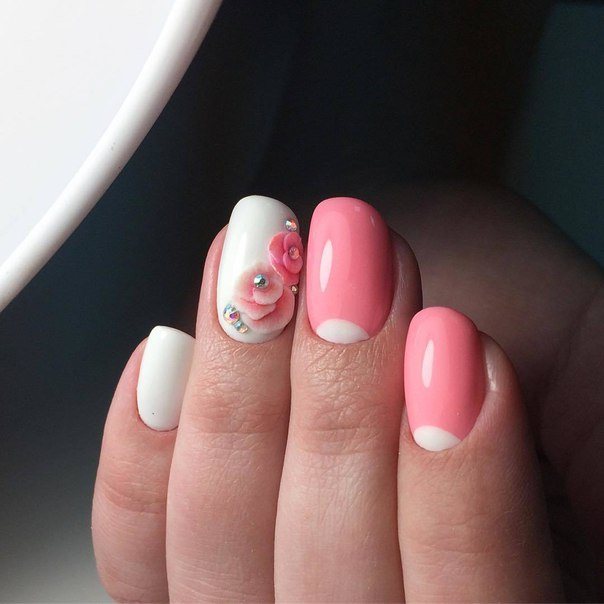 Une bonne option pour une manucure de fête est le dégradé. Tout d’abord, appliquez un revêtement blanc afin que le clou ne brille pas et travaillez au-dessus de chaque clou avec la technique du dégradé, qui peut être appris dans les ateliers proposés. Pour rendre la conception plus intéressante et plus festive, couvrez vos ongles avec un dessus de sable en une couche. En manucure, l’accent peut être mis sur l’un des doigts sous la forme d’une délicate fleur en silicone, vendue dans les magasins de nail art. Le décor en silicone est installé sur le revêtement des ongles à l’aide d’une colle spéciale pour la manucure. Le séchage des gels lustrés ne retient pas les éléments en silicone. Le décor est soigneusement collé, patiemment, en appuyant chaque coin sur le clou. Cela vous permettra de marcher plus longtemps avec une belle manucure printanière. Pour imposer un décor au décor, par exemple, coller des strass ou des perles sur les fleurs en silicone, vous devez découper soigneusement la couche supérieure du décor en silicone et accrocher l'élément brillant à cet endroit.