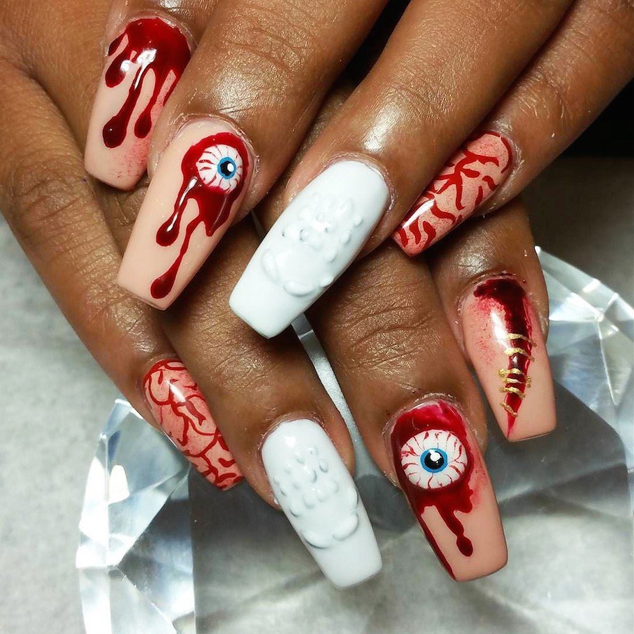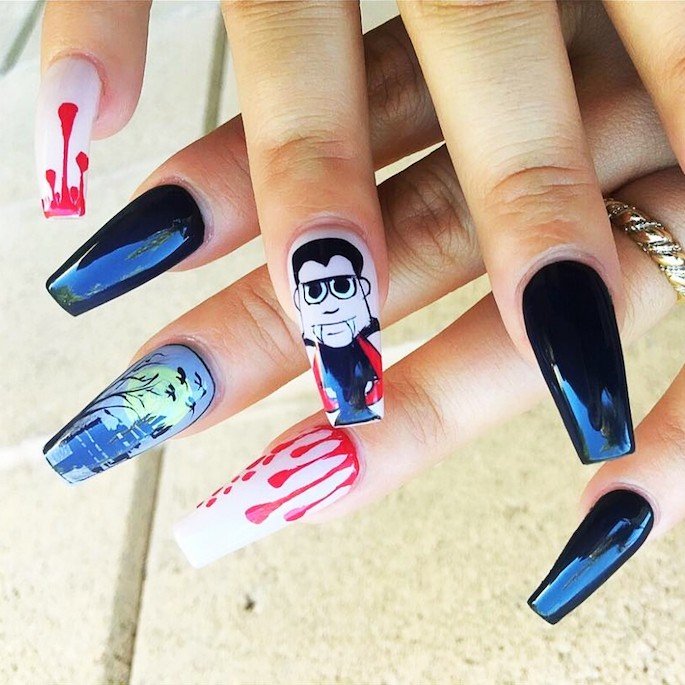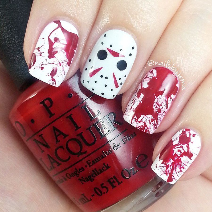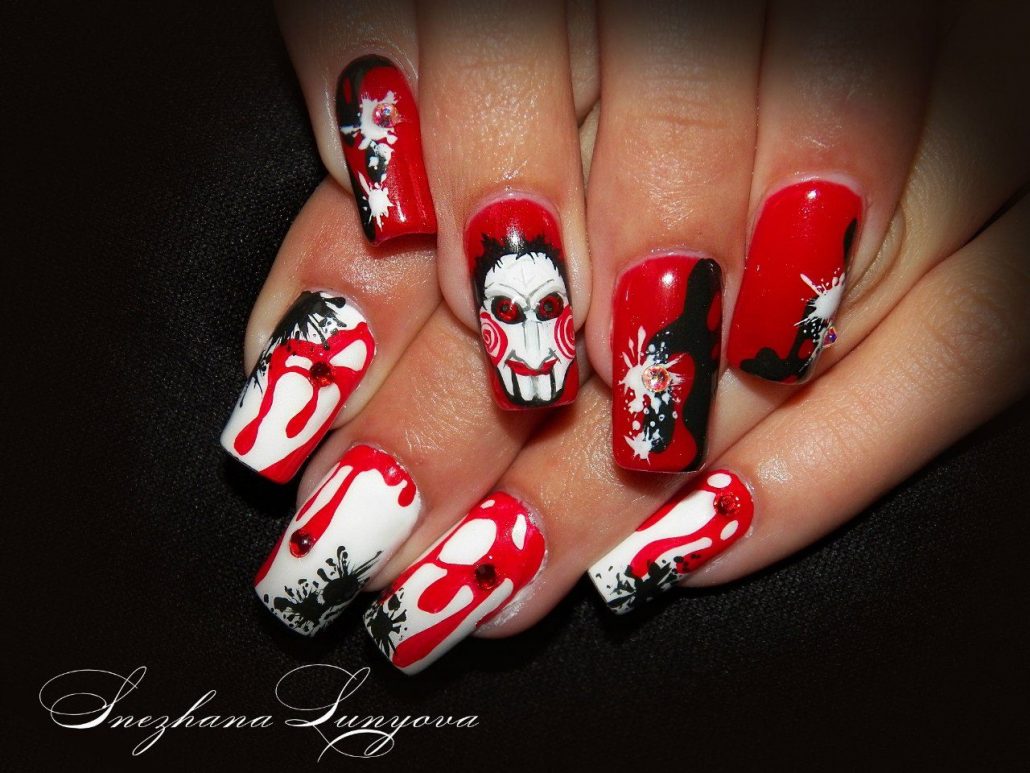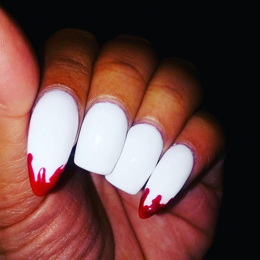 Une bonne idée serait une manucure avec l'effet de sang éclaboussé. Vous pouvez faire quelque chose comme ça vous-même. Pour ce faire, les ongles sont peints en blanc. Ensuite, une petite quantité de vernis rouge est coulée sur toute surface dure. À l'aide d'un tube à boissons dont le bord tombe dans cette flaque, une goutte de sang est appliquée sur la plaque à ongles. Pour ce faire, il suffit de souffler le vernis qui a pénétré à l'intérieur du tube sur le clou.