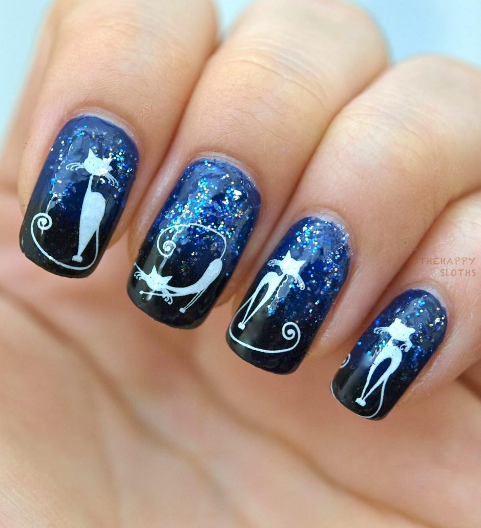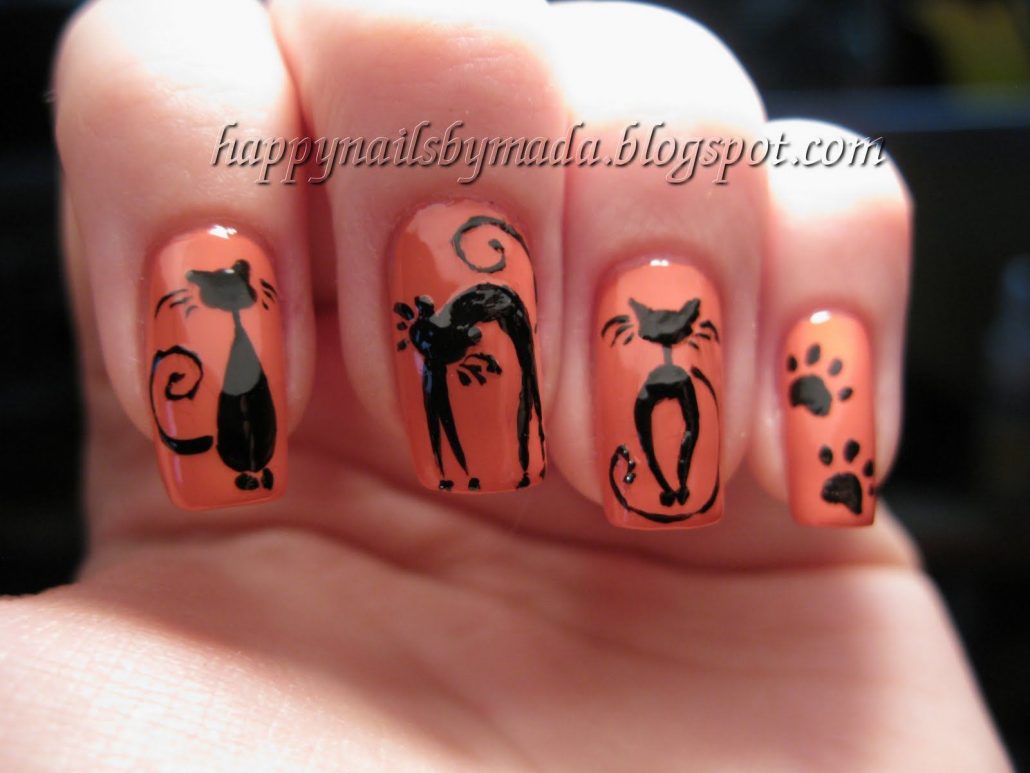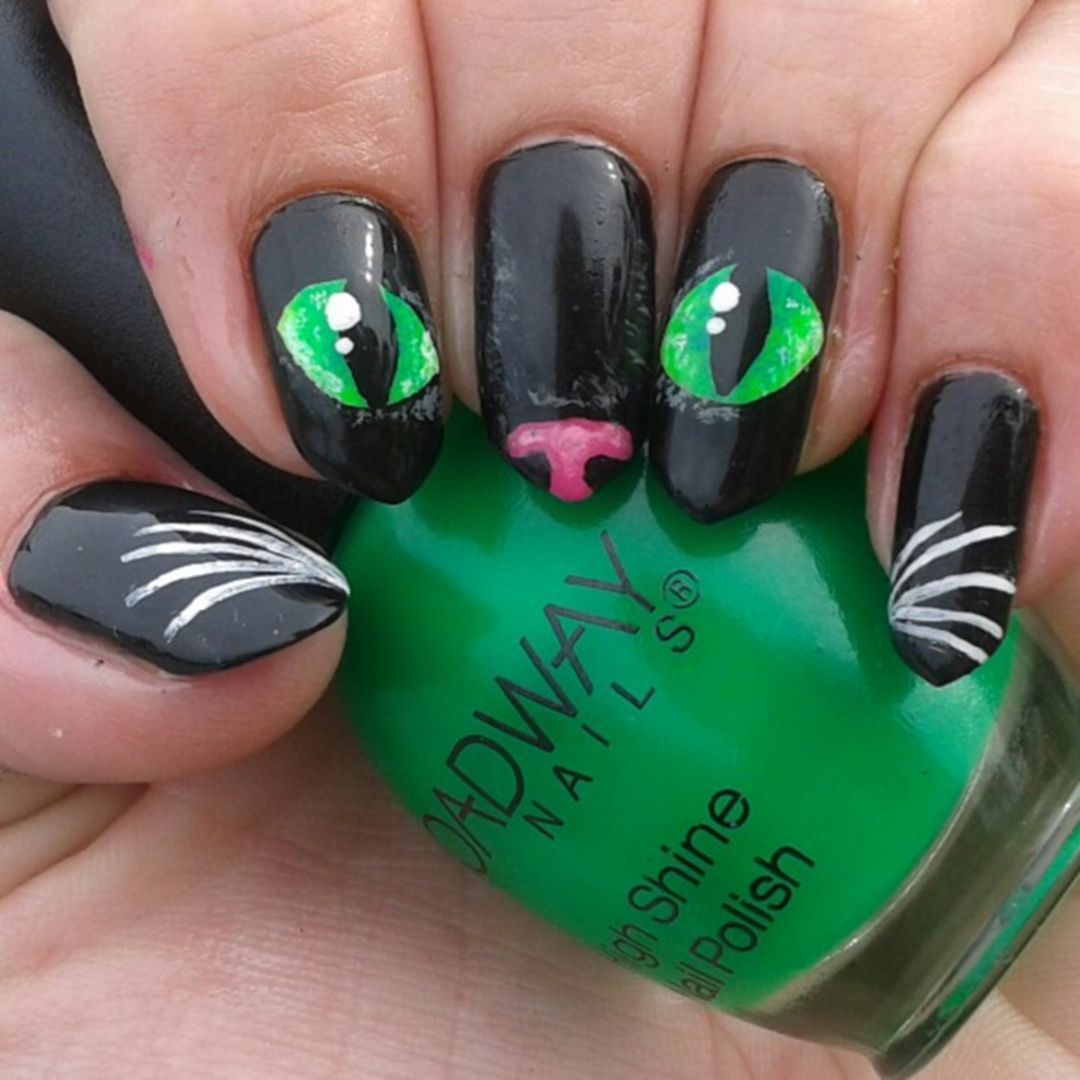 Par conséquent, il n’est pas surprenant que cet animal mignon soit également devenu un symbole de la fête. Quoi qu'il en soit, les chats sont plus mignons et drôles que terrifiants et effrayants. Par conséquent, les filles les choisissent souvent pour décorer leur manucure de vacances avec des citrouilles.