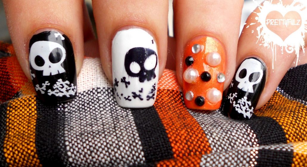 - Avec la même laque noire sur une base orange, des visages terrifiants avec un nez, des yeux et un sourire épouvantable. Ce n’est pas effrayant si elles se révèlent inégales.