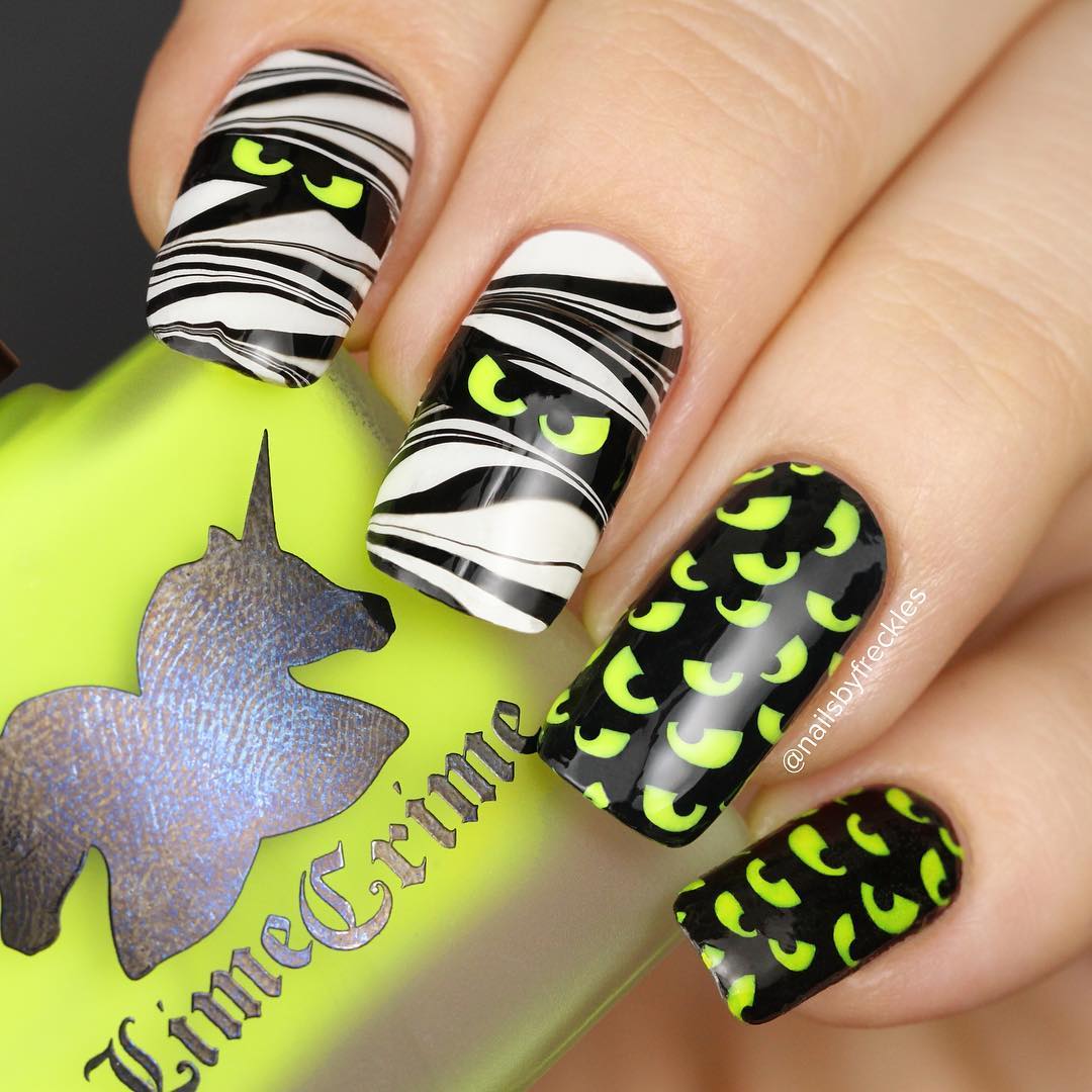 Les yeux auront l’air original et mignon sur les ongles. Faire un tel dessin est très simple, mais il a l'air élégant et approprié pour une telle fête.