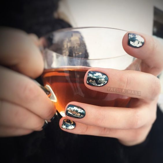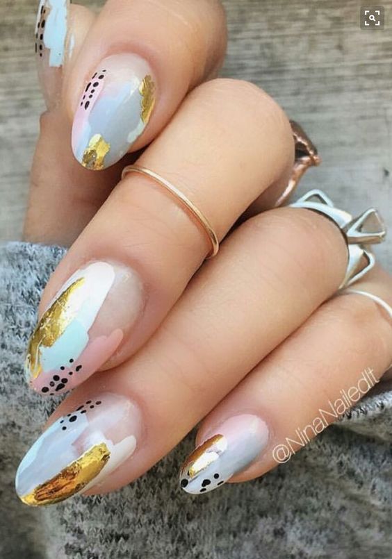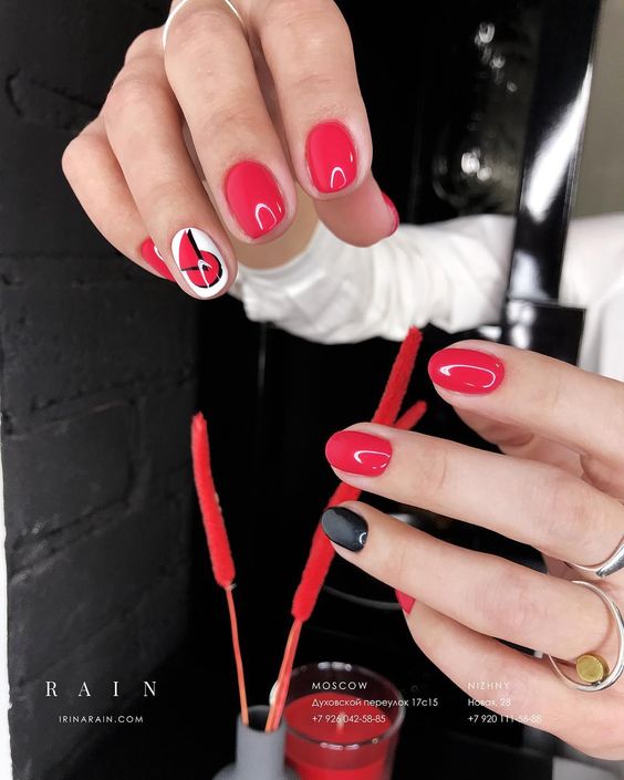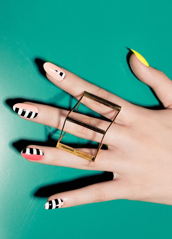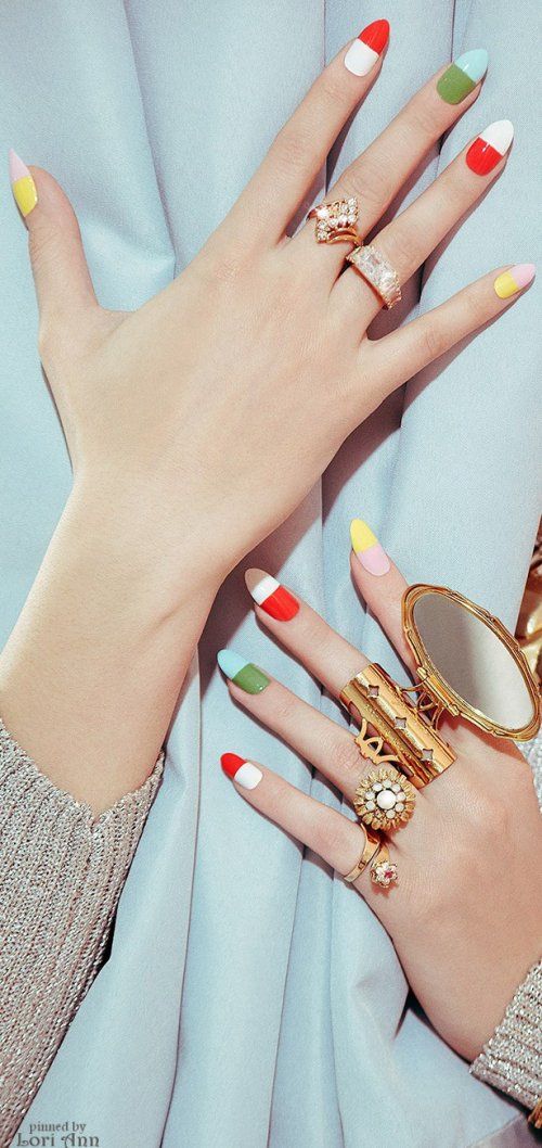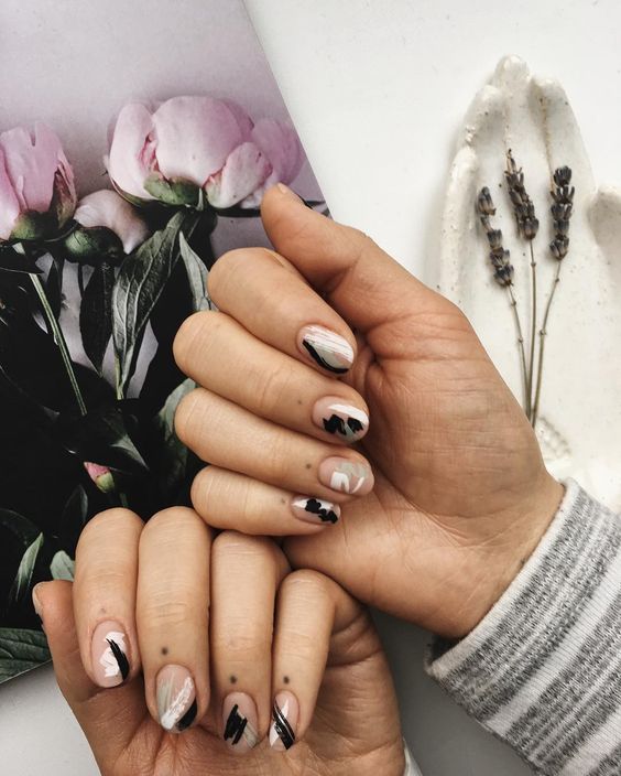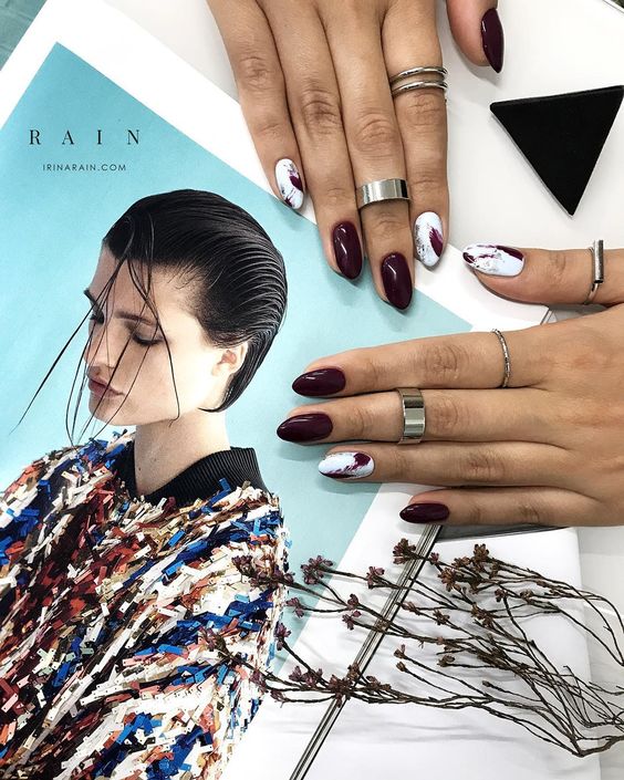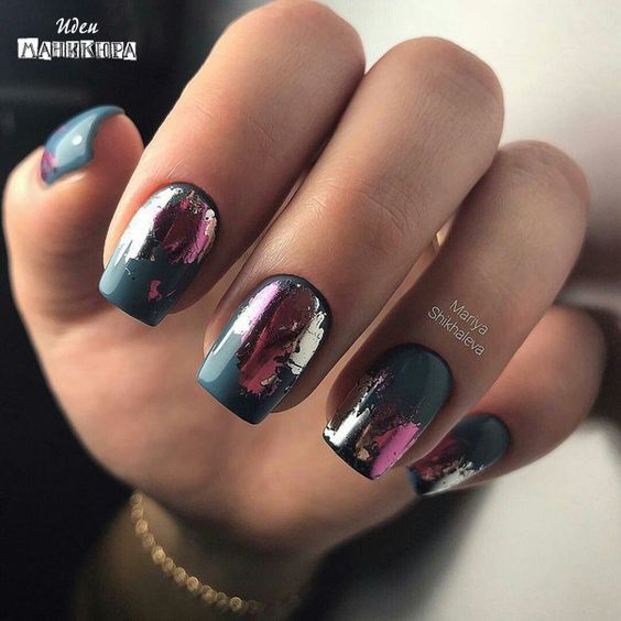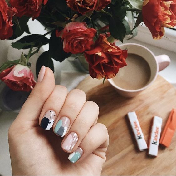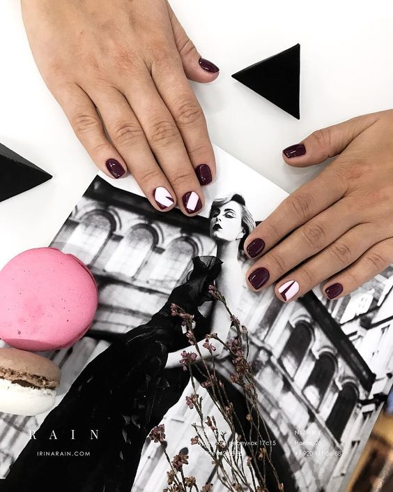 En outre, l’un des manucures populaires pour les ongles courts cet automne sera un motif coloré. C'est à ce moment que chaque ongle est peint dans une couleur individuelle différente et possède son propre motif distinct et unique. Mais si vous pensez que cette option est trop brillante, appliquez un vernis brillant sur un seul ongle. Utiliser du papier d'aluminium dans la conception des ongles cette saison ne sera pas non plus superflu. Des impressions, des rayures, des zigzags sur tous, plusieurs ou un seul clou complèteront votre manucure en septembre.