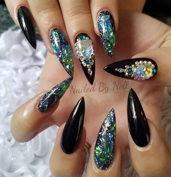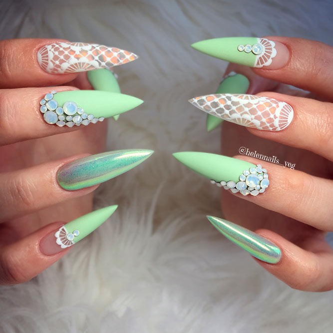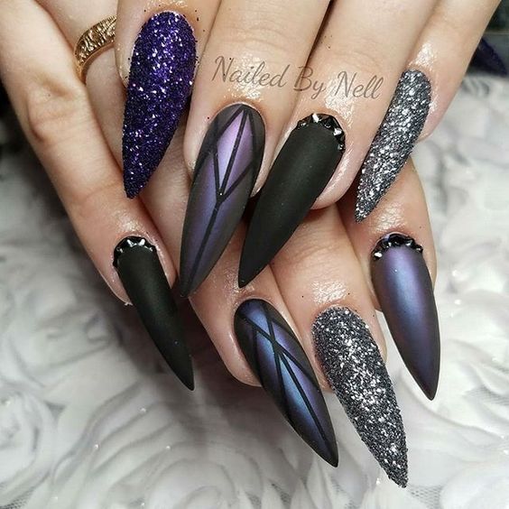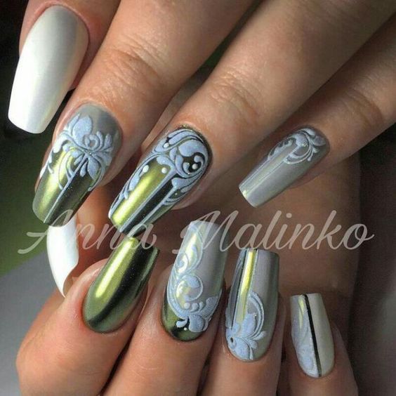 Cet automne et cet hiver, nous n'abandonnerons pas la populaire veste et manucure lunaire. Chaque année et chaque saison, de nouveaux ajouts à la conception sont ajoutés à une telle manucure. À l'automne-hiver 2026, le blouson habituel et le revers restent pertinents. Les bleus et les verts sont particulièrement populaires. Mais si vous souhaitez ajouter de la brillance et de l'originalité à une telle manucure, les éléments métalliques qui ornent la surface des ongles sont l'option la plus appropriée.