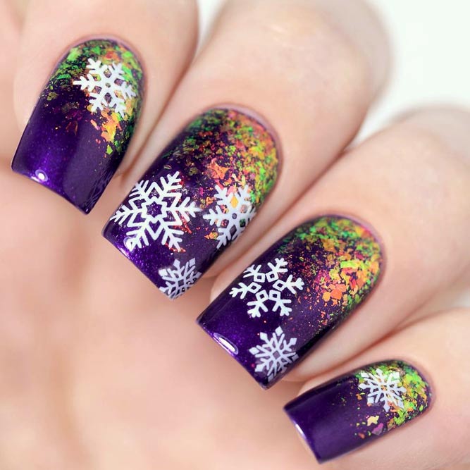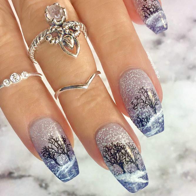 Manucure avec un ornement neigeux gagne en popularité. De tels motifs givrés semblent avantageux à la fois pour les teintes claires et sombres du vernis. Par temps froid, une manucure avec un paysage d'hiver aura fière allure. Une telle manucure deviendra encore plus efficace si la surface prend du volume avec de la poudre acrylique ou du velours. La manucure d'hiver à la mode de 2026 combine des couleurs pastel délicates et des teintes vives et saturées.
