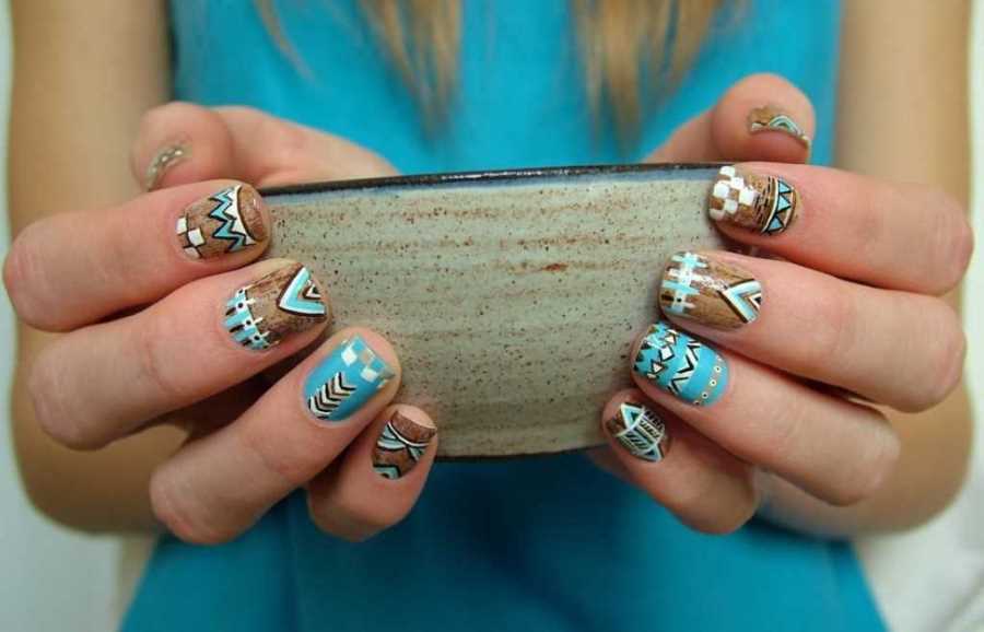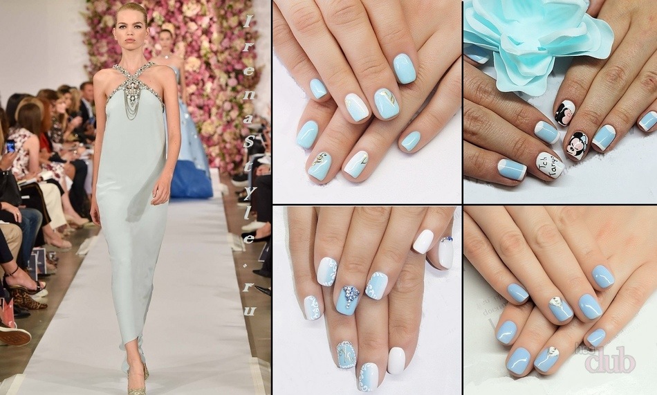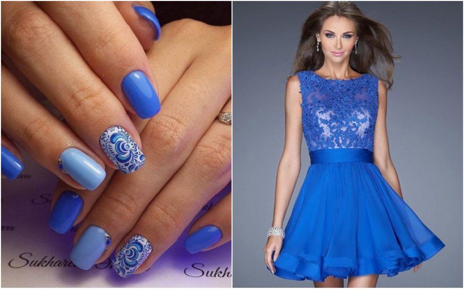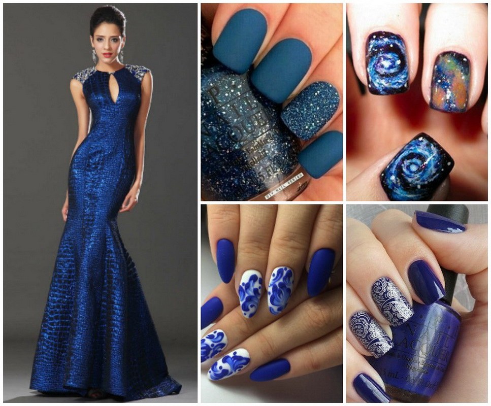 Vous pouvez utiliser des couleurs vives et neutres pour la manucure avec une robe dans une teinte bleue. De nombreux maîtres de salons professionnels pour cette couleur de garde-robe utilisent des revêtements de lit et de peau de vernis. Ce sont ces nuances qui peuvent conférer au style féminin élégance et style. Il est également à la mode d’utiliser une couleur dorée dans une manucure, surtout si vous utilisez le trou dans la direction opposée.