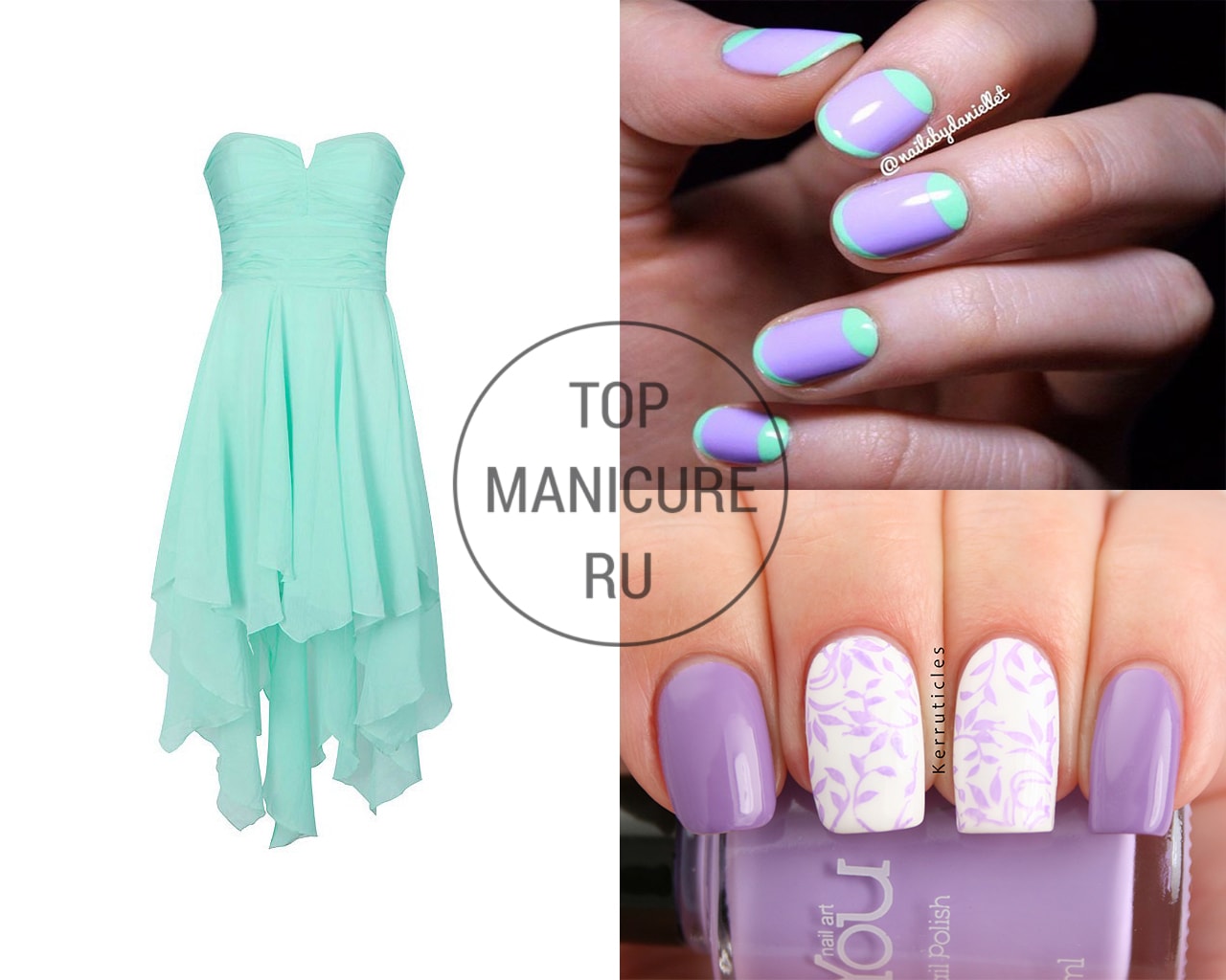 Pour une robe de couleur verte, une manucure en bleu est idéale. Un merveilleux ajout servira d'ornement sous forme de formes géométriques et de dégradés bleu-vert. De plus, les éléments roses (fleurs, rayures ou verre brisé) sur fond bleu conviennent à la nuance verte de la robe.