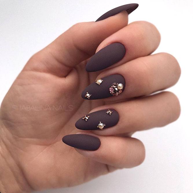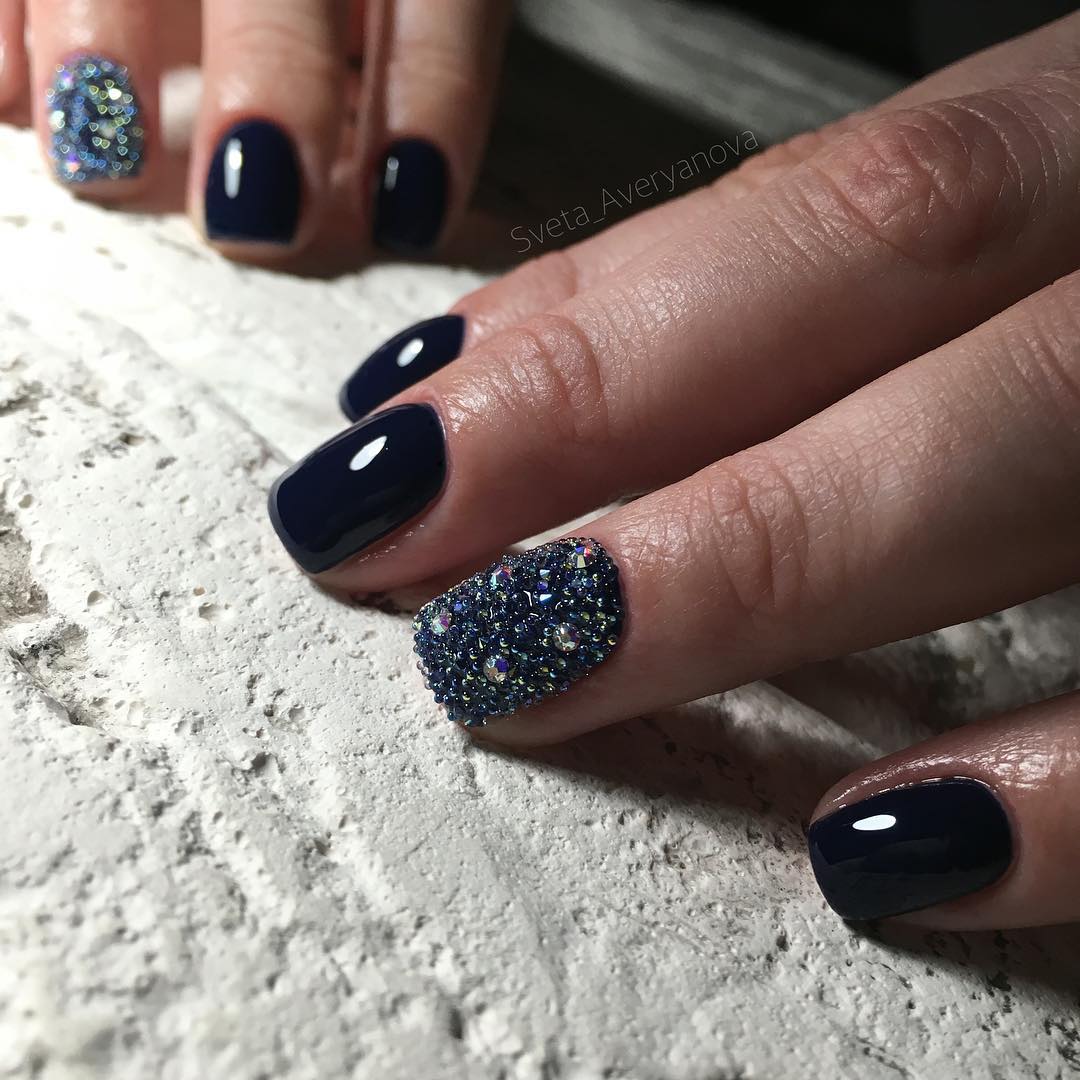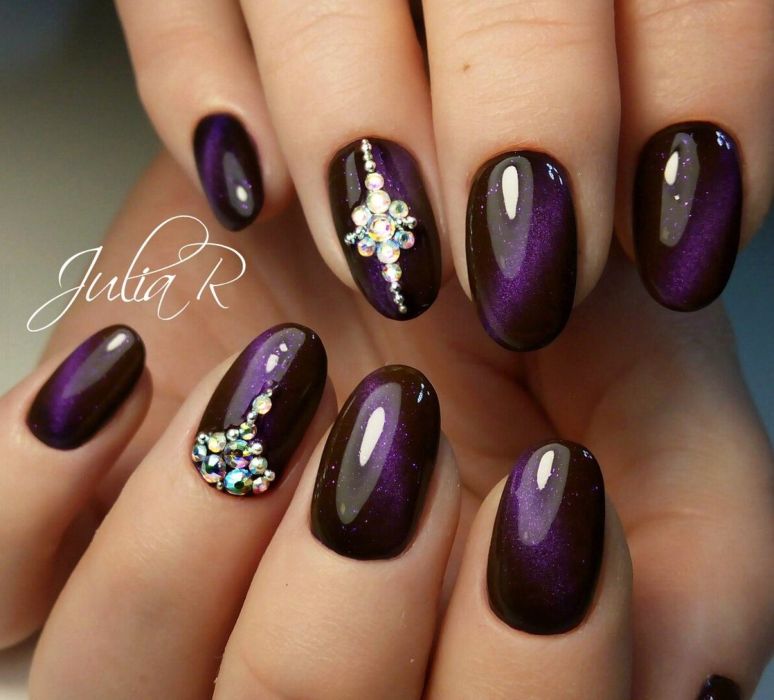 Les nuances noires de bouillons sont une excellente décoration pour une manucure solennelle et le soir. Grâce aux capacités de conception, toute fille ou femme peut donner à sa soirée un air noble et choquant. De nombreux maîtres en manucure préfèrent que les bouillons noirs ne soient pas recouverts d'un agent fixant. Cela est dû au fait que le plateau pourra noyer l'éclat d'une manucure chic et que les petits cailloux irisés perdront leur belle apparence.