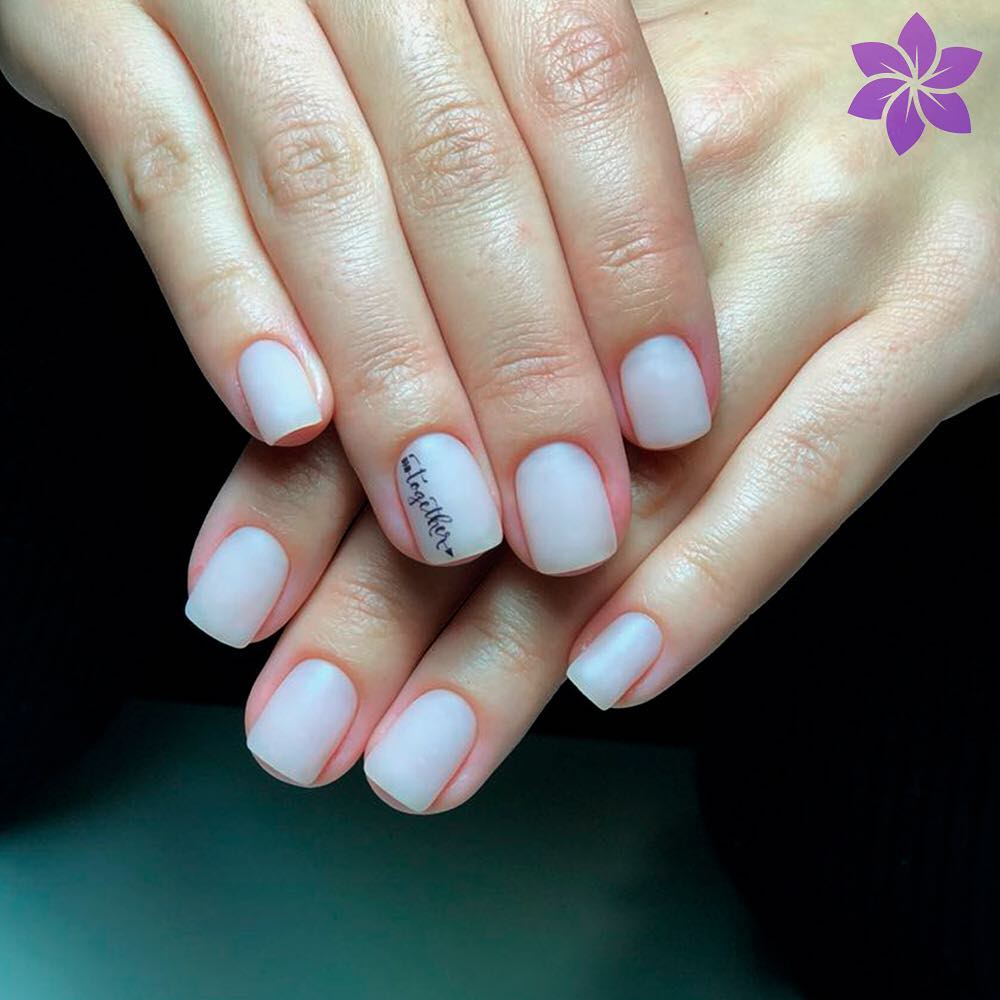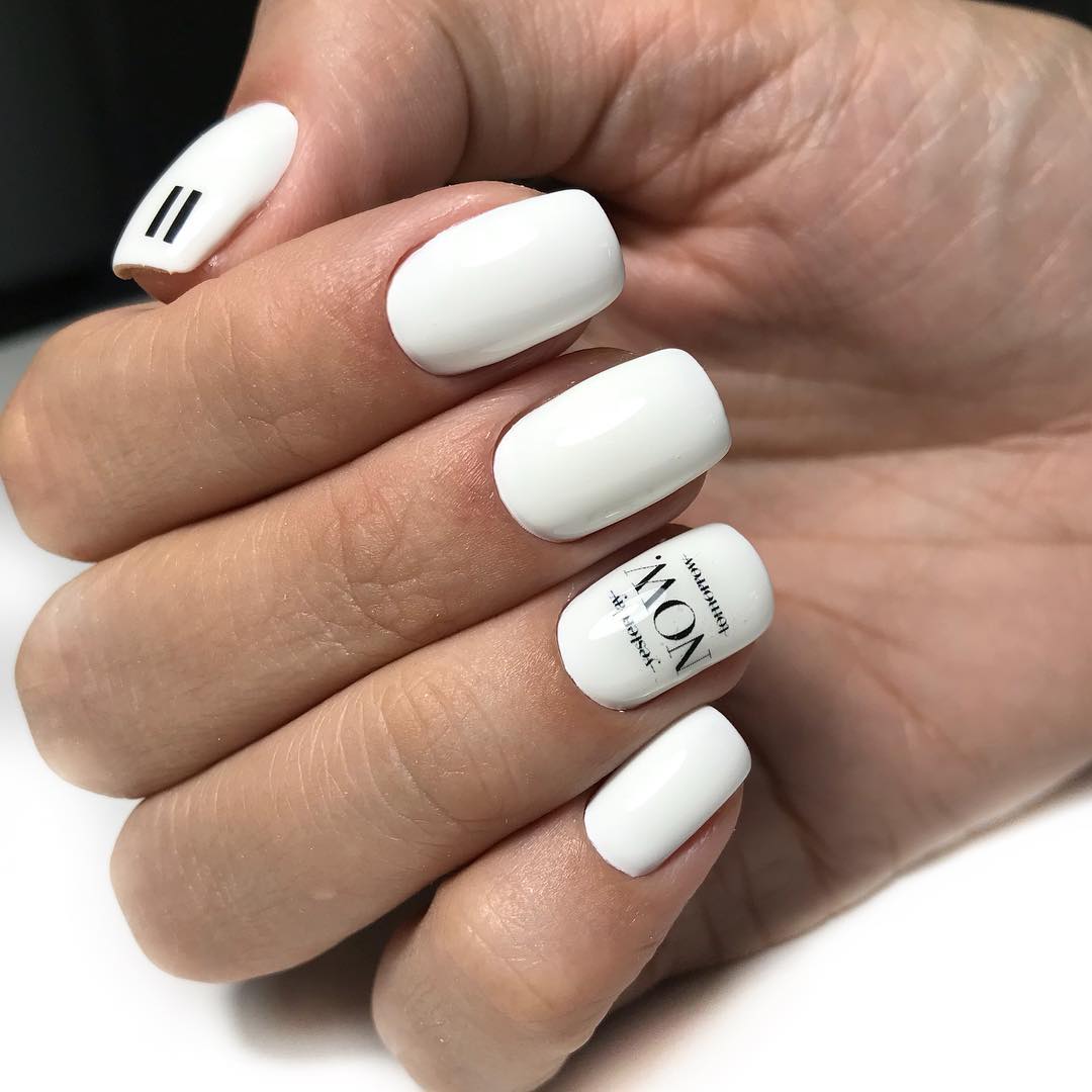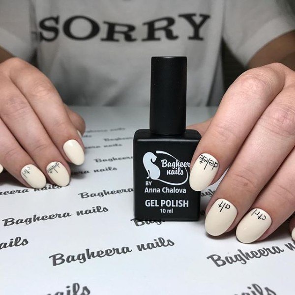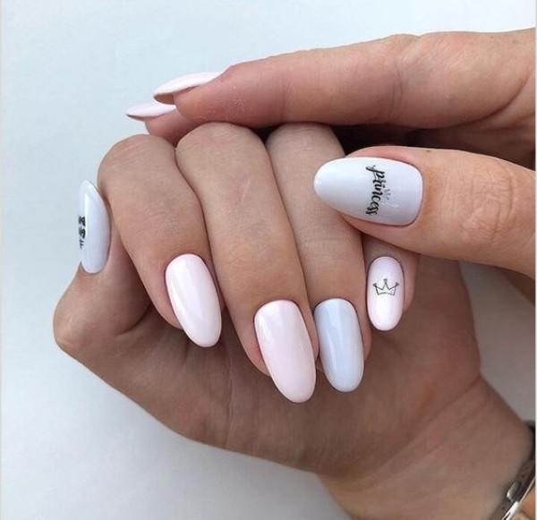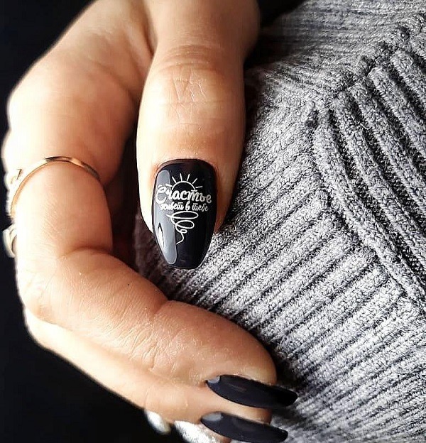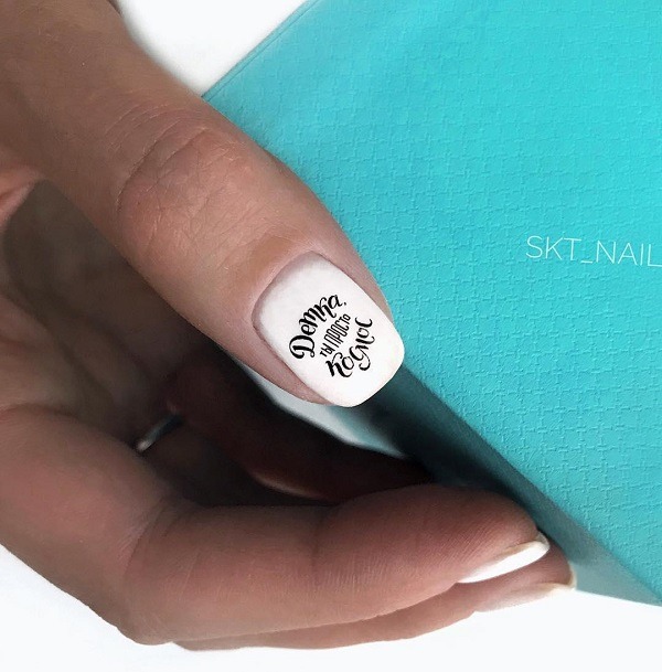 Malgré toute la variété des polices et des inscriptions, beaucoup de gens aiment le minimalisme beaucoup plus. C’est une excellente option pour toutes les occasions, du travail au soir. Comme vous le savez, la beauté est dans la simplicité. Par conséquent, faites audacieusement un revêtement simple avec une petite phrase belle ou un mot. Dans ce cas, il est préférable de choisir des tons neutres tels que le beige, le noir, le blanc, le gris ou le bleu. L'inscription peut être faite indépendamment ou utiliser des autocollants spéciaux. Cette conception a toujours l’air particulièrement belle et moderne, quelles que soient la longueur et la forme des ongles.