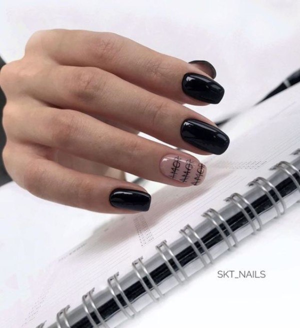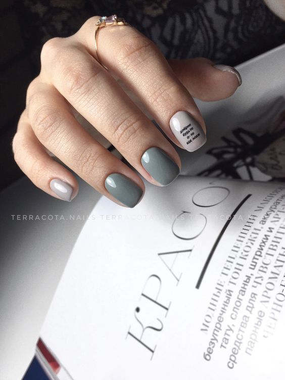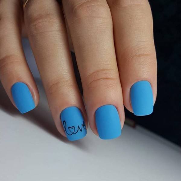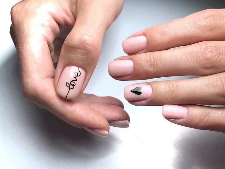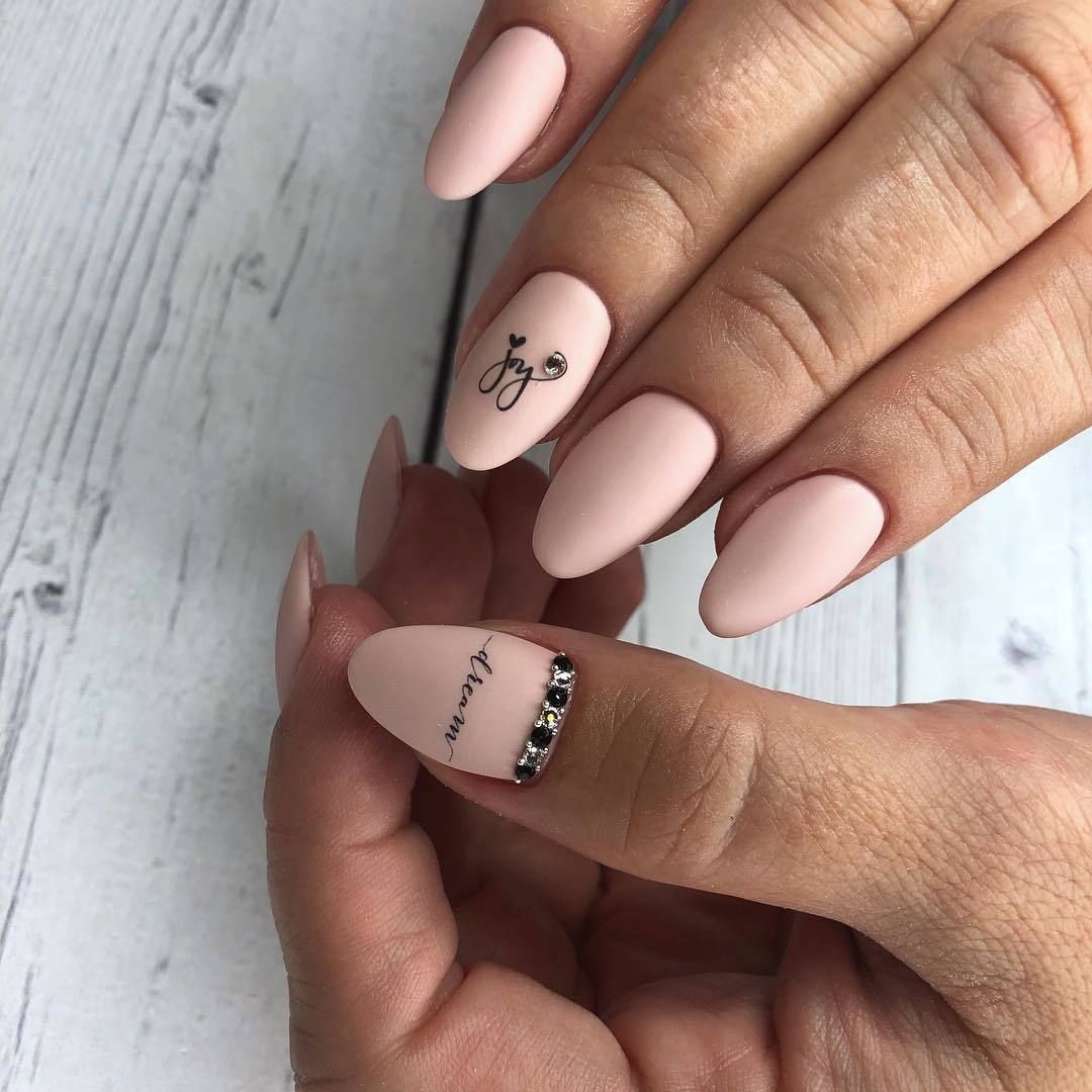 Malgré toute la variété des polices et des inscriptions, beaucoup de gens aiment le minimalisme beaucoup plus. C’est une excellente option pour toutes les occasions, du travail au soir. Comme vous le savez, la beauté est dans la simplicité. Par conséquent, faites audacieusement un revêtement simple avec une petite phrase belle ou un mot. Dans ce cas, il est préférable de choisir des tons neutres tels que le beige, le noir, le blanc, le gris ou le bleu. L'inscription peut être faite indépendamment ou utiliser des autocollants spéciaux. Cette conception a toujours l’air particulièrement belle et moderne, quelles que soient la longueur et la forme des ongles.