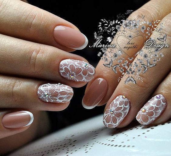 La manucure lunaire, comme la manucure française avec marguerites, ajoute à son propriétaire d'élégance et de féminité. Ce type de design est parfait pour le beau sexe de tout âge et avec n'importe quelle longueur de clou. Une telle conception de clou aura l'air à la mode et pertinente lorsque le trou servira de noyau. L’utilisation de strass, de pierres ou d’étincelles ajoutera à la fête une telle manucure.