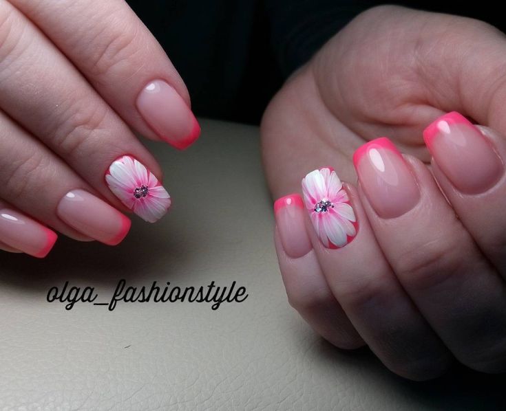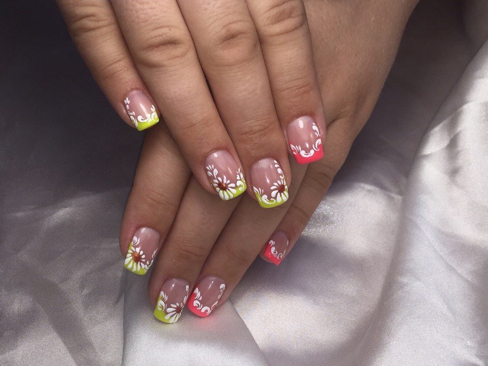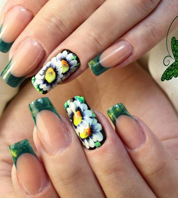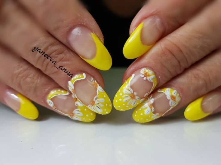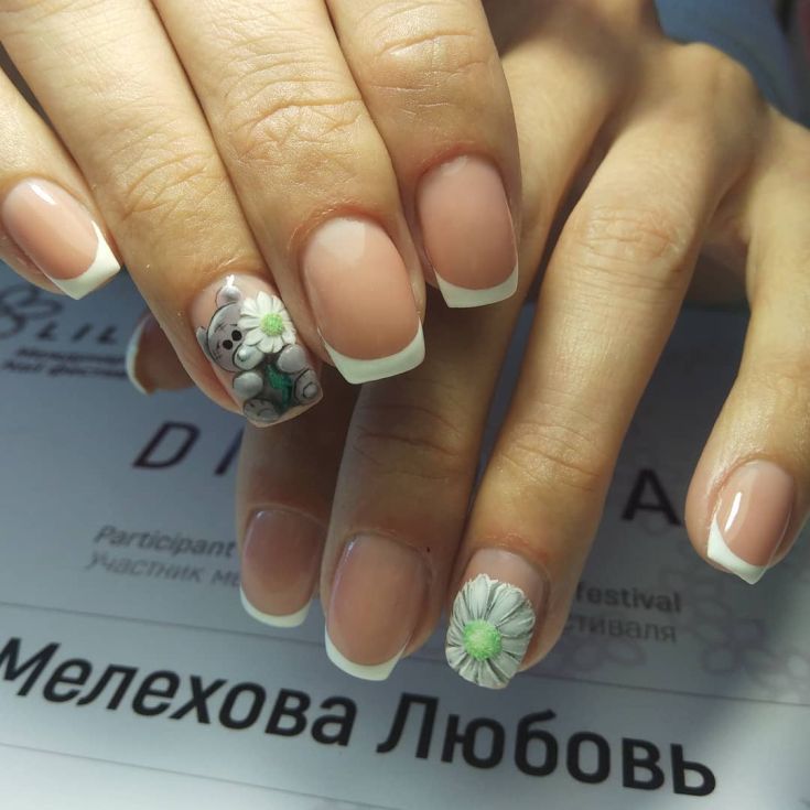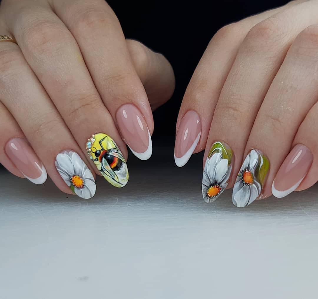 En effectuant une manucure française classique et en la complétant de délicates fleurs de camomille, vous obtiendrez un tout nouveau look pour vos ongles. Une telle manucure aura l’air original avec un sourire jaune, tout en laissant l’ensemble de l’ongle dans des tons incolores, avec plusieurs couleurs délicates éparpillées. Une excellente manucure française ressemble à de grandes fleurs sur un ongle, et des fleurs plus petites peuvent orner tous les autres ongles.