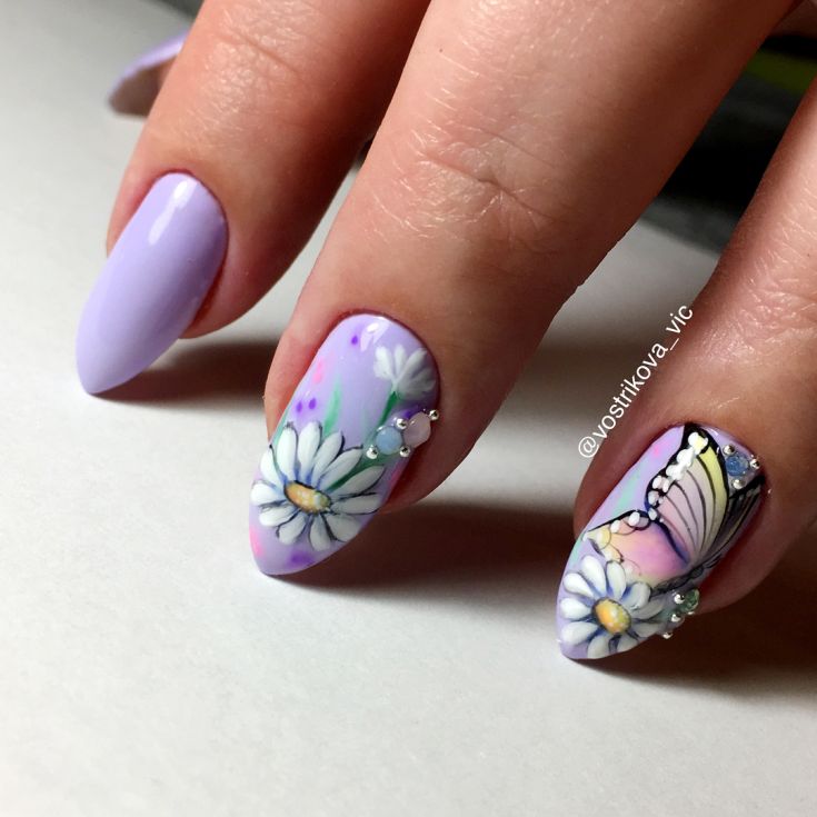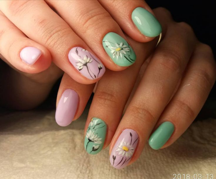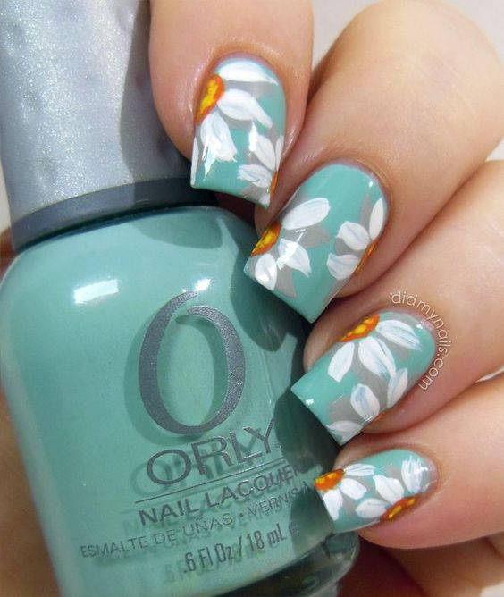 Manucure avec marguerites et motifs géométriques.