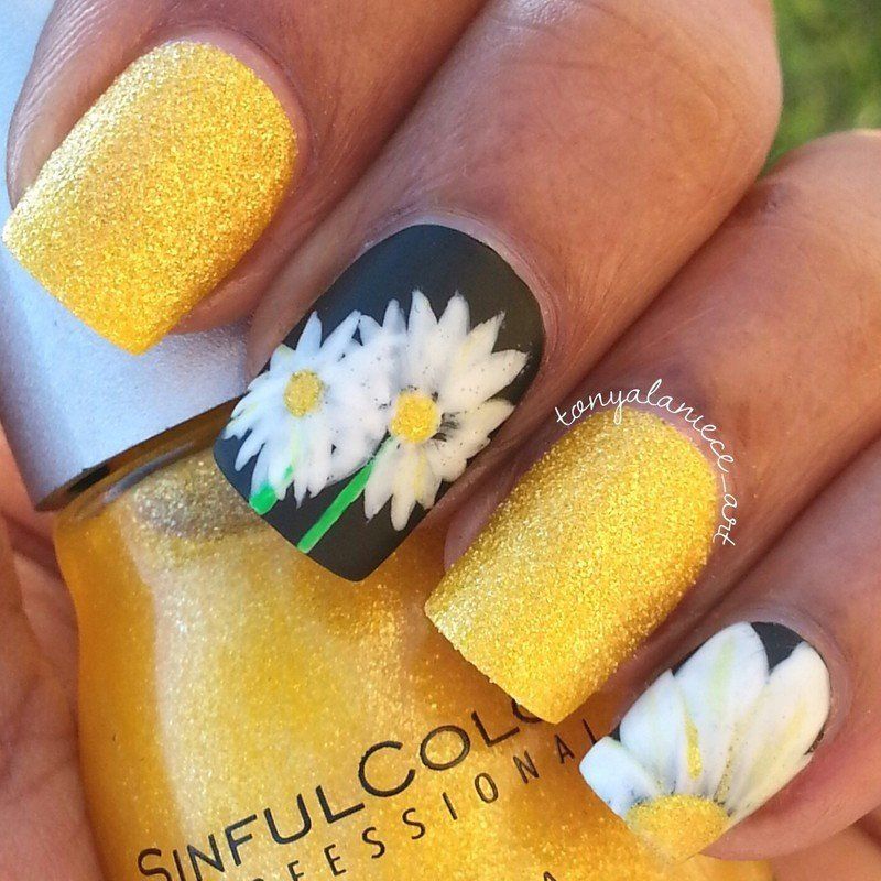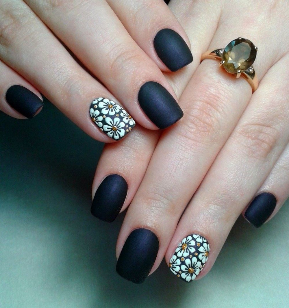 On croit que la manucure avec marguerites est quelque chose de calme et doux, où la couleur la plus brillante est le jaune. Mais les concepteurs modernes ont dissipé les stéréotypes et proposent aujourd'hui de combiner des fleurs de marguerite délicates avec d'autres couleurs vives, notamment le noir. Veuillez noter que les délicates fleurs de marguerite jaune-blanc sont élégantes et attrayantes sur une base noire. Les marguerites sur fond noir ont fière allure non seulement pendant la saison chaude. En décorant une telle manucure avec des strass, vous obtiendrez un nail art glamour pour l'image du nouvel an. Voulez-vous créer une version de soirée inoubliable de manucure avec des marguerites? Effectuer des fleurs avec des noyaux de différentes couleurs, tandis que le ton principal devrait être noir ou des nuances sombres.