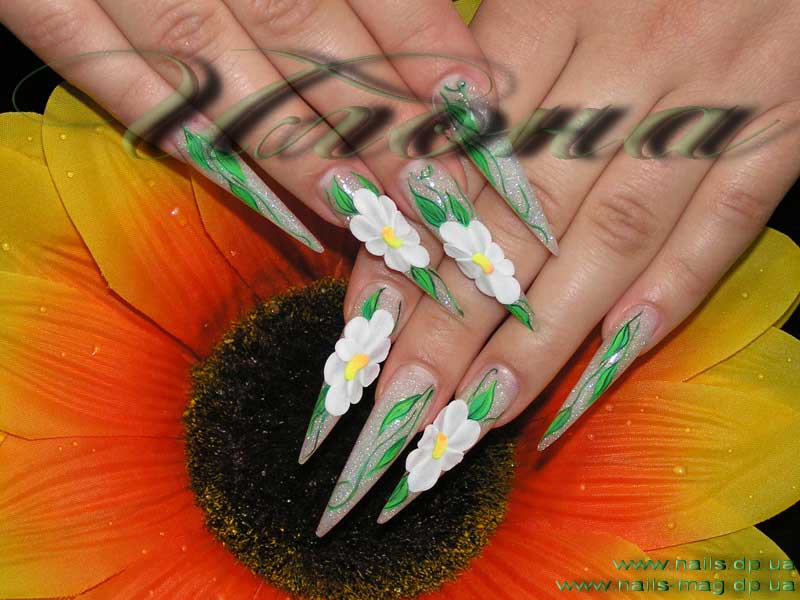 La camomille sur de longs ongles est un design délicat, lumineux et très attrayant. De longs clous vous permettent d'incarner divers envols de fantasmes de conception. Il existe de nombreuses façons de créer une manucure aussi fantastique. Cela peut être une option douce et discrète utilisant une seule fleur, ou bien une manucure lumineuse avec une dispersion de petites fleurs de marguerite décorées avec des strass ou des étincelles. Une manucure sur des ongles longs avec un effet caméléon, c'est-à-dire utilisant plusieurs couleurs, sera magnifique. Une camomille, faite dans un ton, donnera à la manucure tendresse et romance. Looks grande manucure avec des marguerites, faite dans la technique du dessin en trois dimensions. La camomille sur les ongles en combinaison avec la peinture chinoise semble fascinante. Vous voulez une manucure plus festive ou le soir? Une bonne option est une camomille bordée de pierres ou de strass.