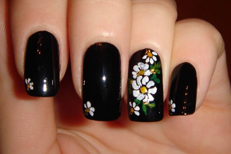 Magnifique manucure avec marguerites sur fond noir