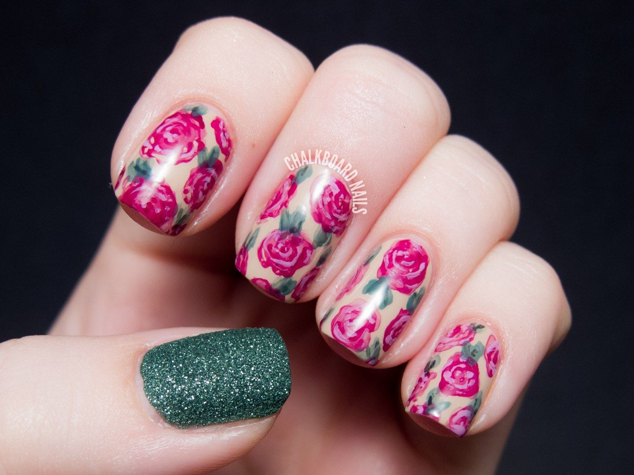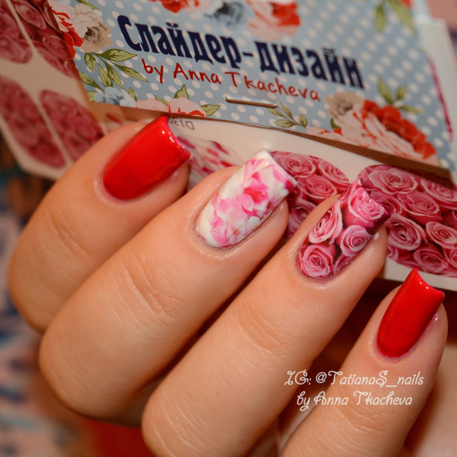 Conception de manucure avec des roses sur la photo.