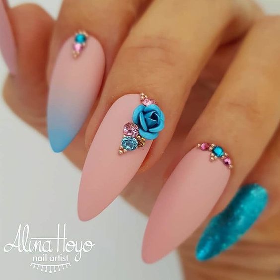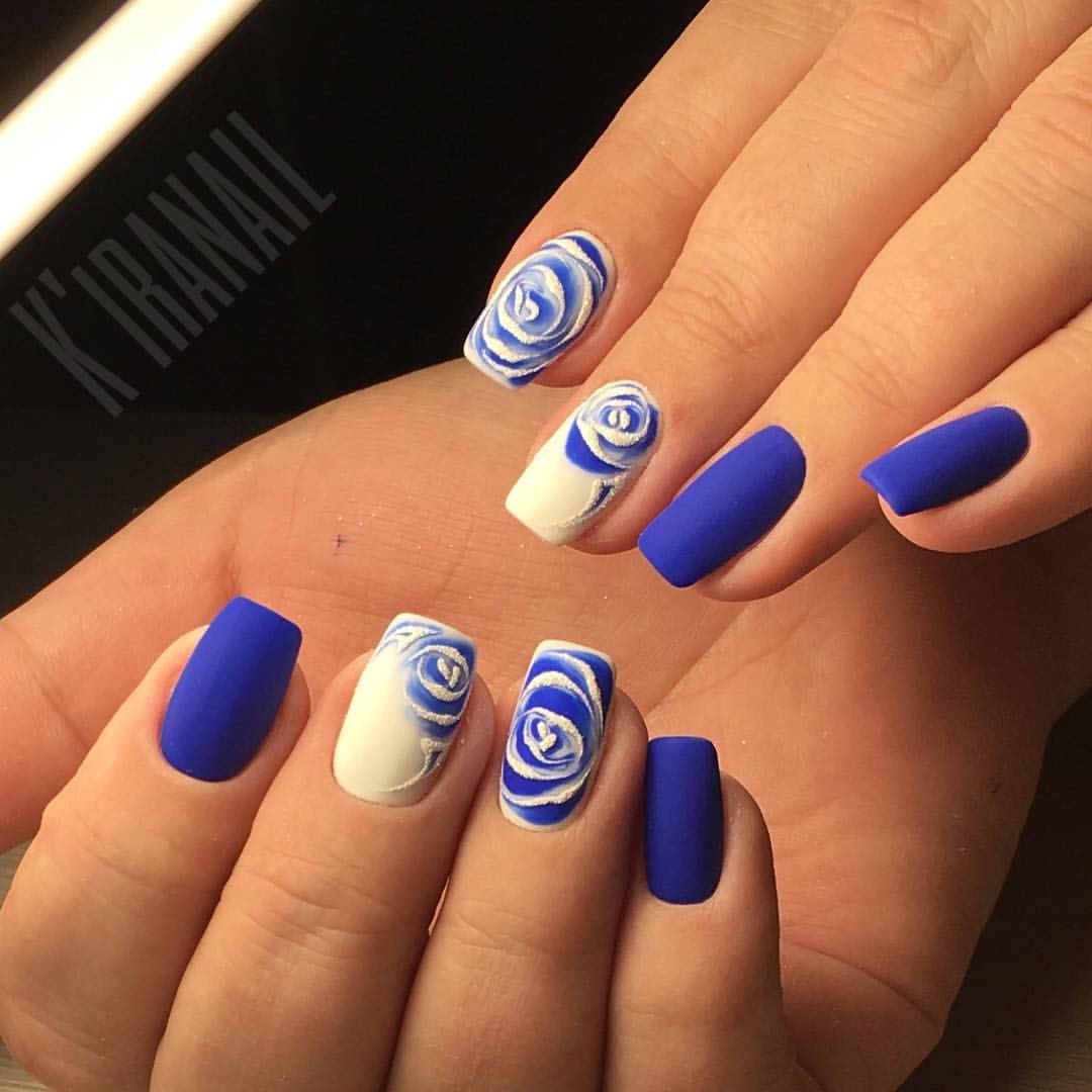 Ce n’est un secret pour personne que la couleur bleue de la rose est considérée comme royale et noble. Après avoir décoré leur manucure avec eux, une femme mettra l'accent sur son originalité et sa grâce. Une rose bleue se mariera très bien à un annulaire blanc. La couleur bleue s'harmonisera bien avec les finitions brillantes et mates.