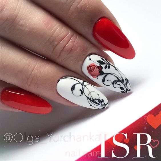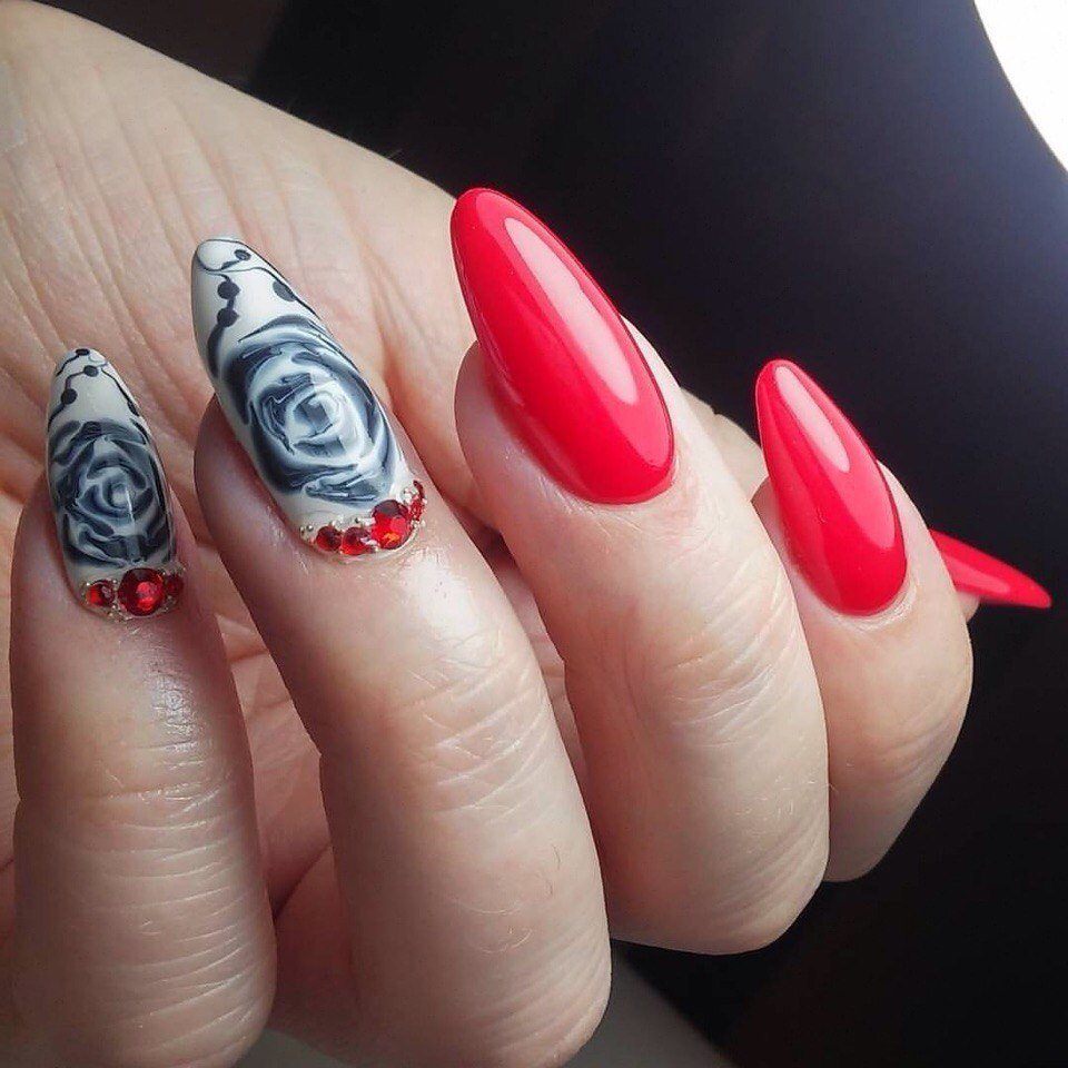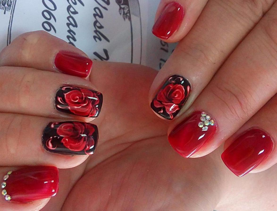 Une rose rouge est le signe d'une femme confiante, passionnée et déterminée. Beaucoup de filles habituées à se mettre à l'honneur préfèrent cette option de conception particulière pour la manucure. Sur le fond de la couleur rouge du vernis, différentes couleurs de peinture peuvent être utilisées: il peut s’agir de roses blanches à tiges vertes ou de roses noires ornées de pollen et de strass dorés.