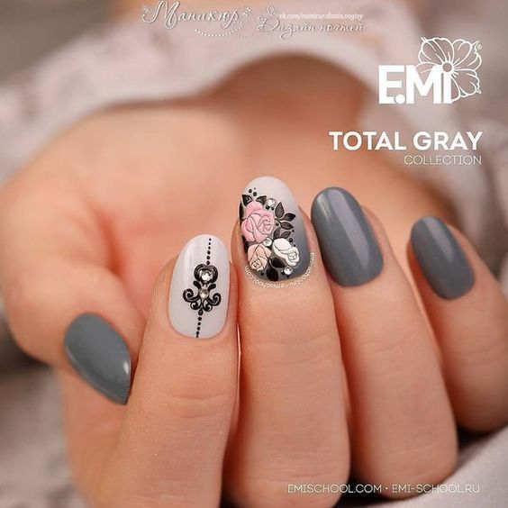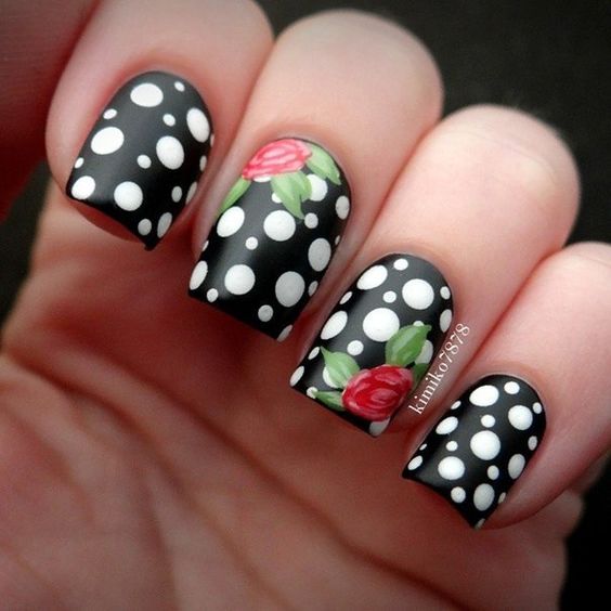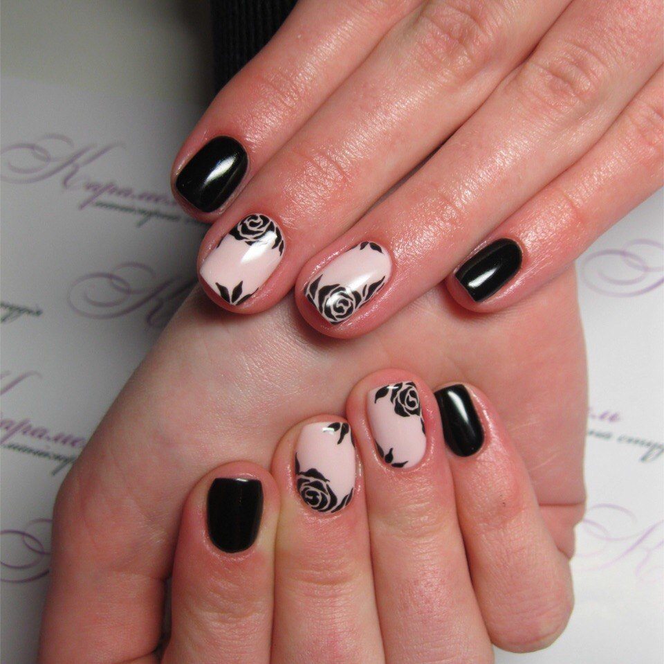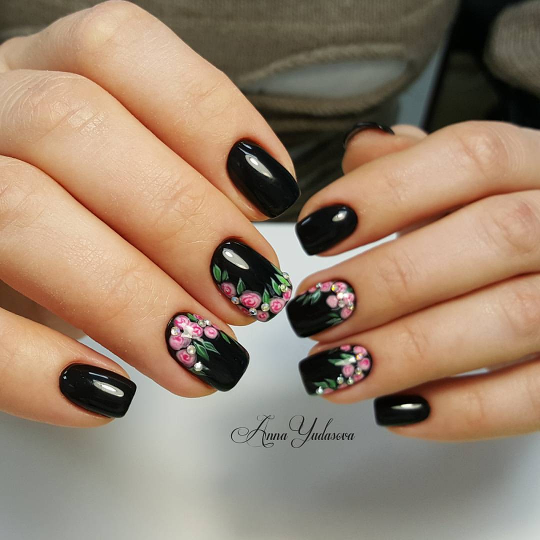 Toutes les filles ne préfèrent pas le noir pour effectuer des manucures, car une telle couleur convient aux dames décisives et fatales habituées à se comporter de manière inhabituelle. Le choix d'une telle conception de manucure convient à tous les jours et aux fêtes. Pour effectuer une manucure avec une teinte noire, il existe de nombreuses options: combiner et mélanger avec d'autres nuances, ainsi que diverses peintures murales. Reine des fleurs - la rose est souvent exécutée en blanc, soulignant ainsi parfaitement l'élégance et la confiance en soi de la jeune fille. Pour mener à bien une telle idée, vous n'avez pas besoin de peindre tous les ongles, un seul suffit (généralement l'annulaire). Si l'ornement floral est complété par une finition mate, une originalité particulière du nail art est alors garantie. Tout dépend du désir et de la personnalité de la fille.