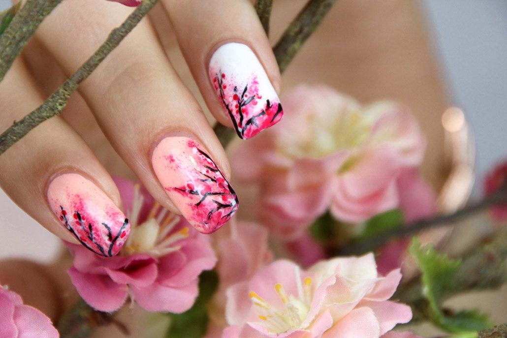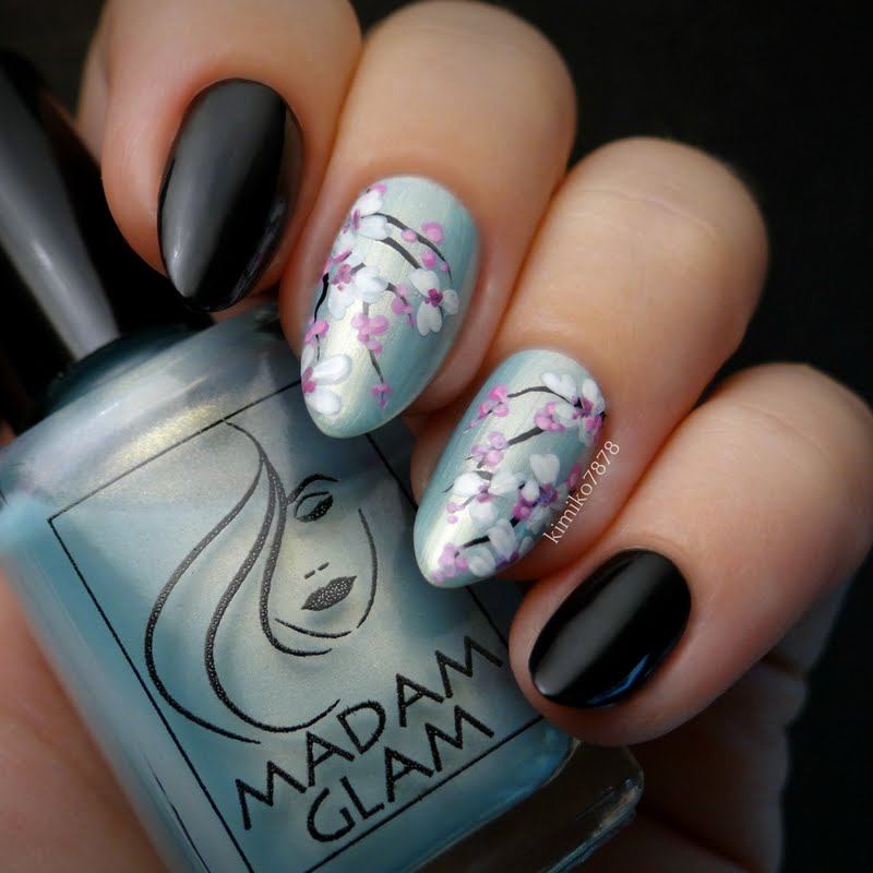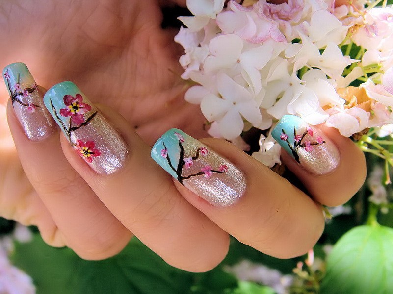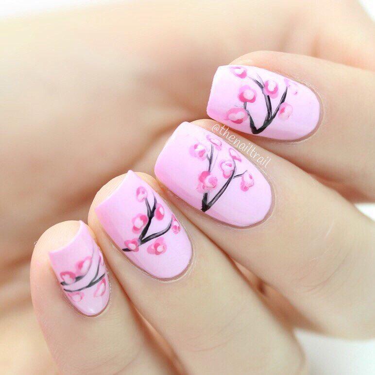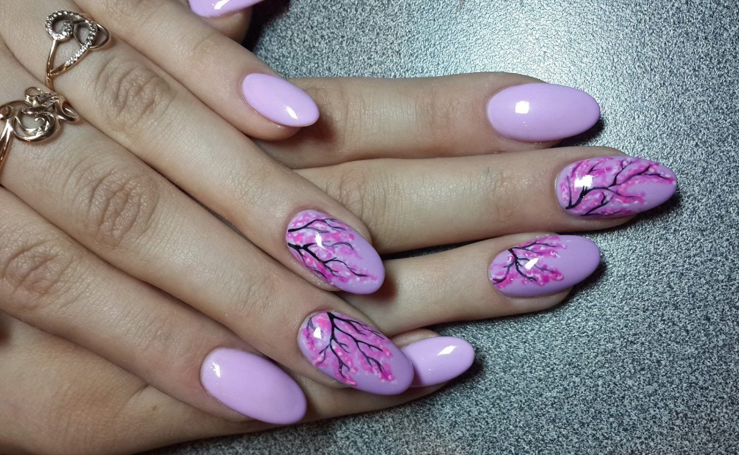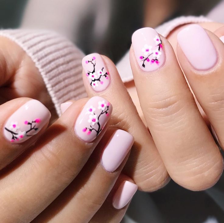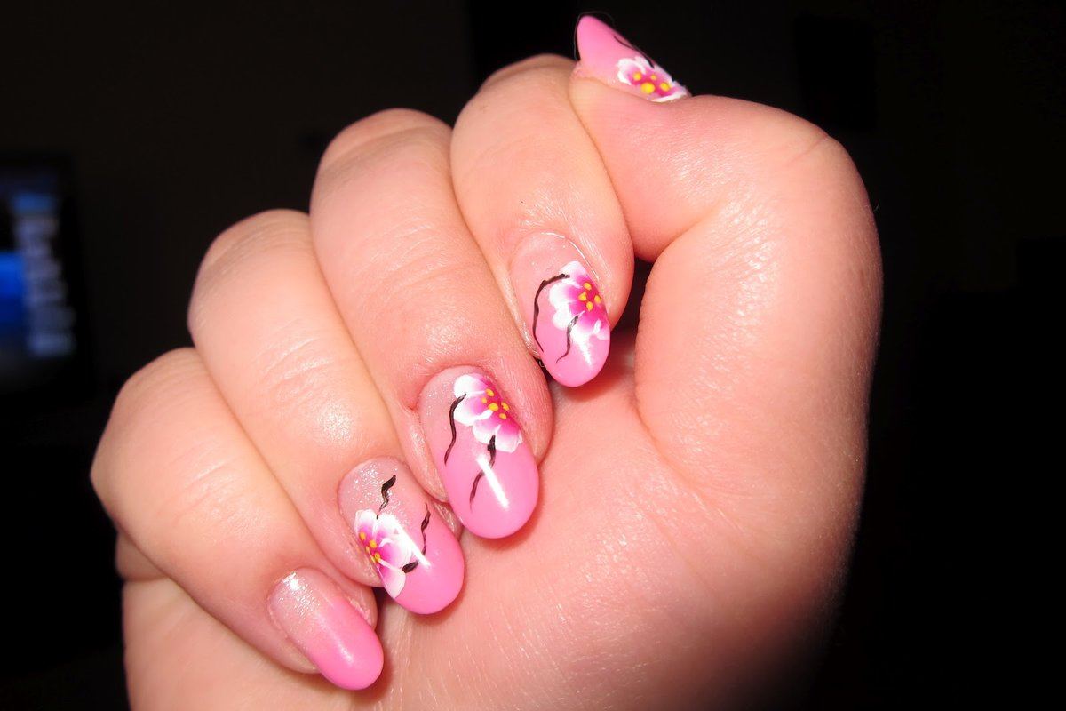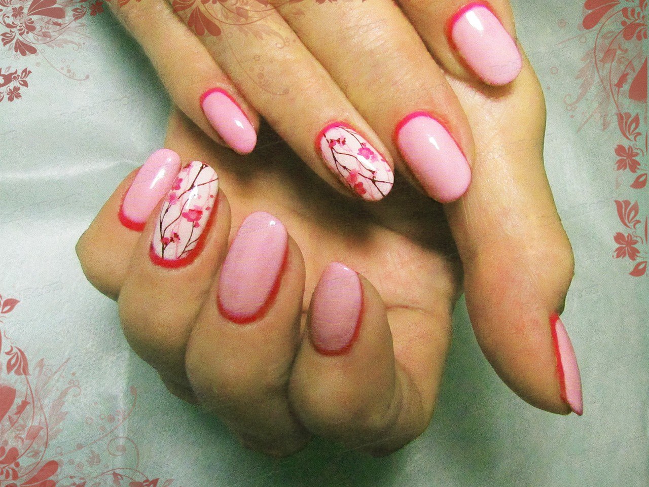 Les amateurs de manucure à la maison devraient commencer par cette option. Vous devez d’abord appliquer une couche monophonique sur tous les ongles et attendre qu’elle sèche complètement. Ensuite, appliquez les branches avec un pinceau fin et de la peinture noire. Veuillez noter qu'il est préférable que le motif ne soit placé que sur quelques ongles. Avec un pinceau légèrement plus large et de la peinture rose, appliquez l’image de fleurs sur les branches. Si vous le souhaitez, le milieu de chaque bouton peut être marqué d'une nuance légèrement plus foncée.