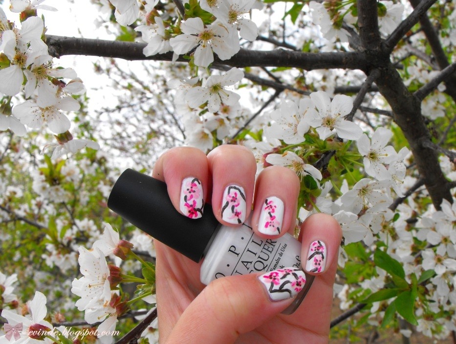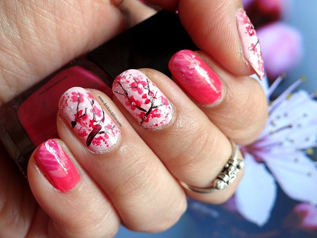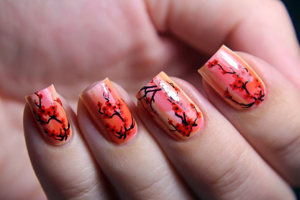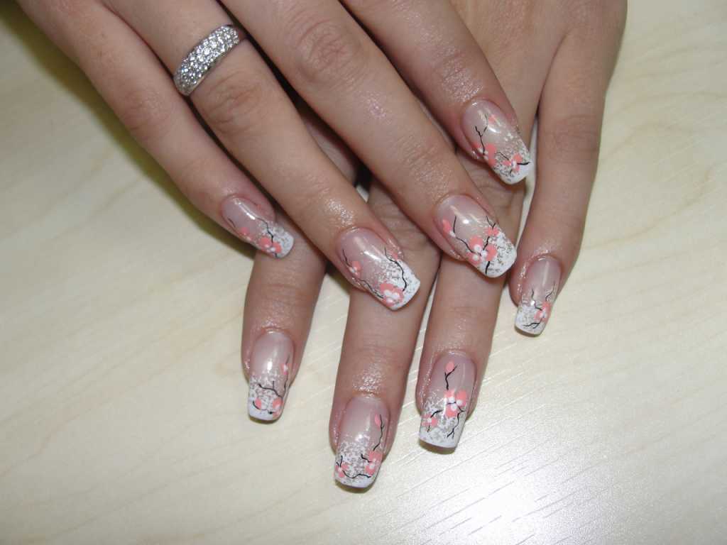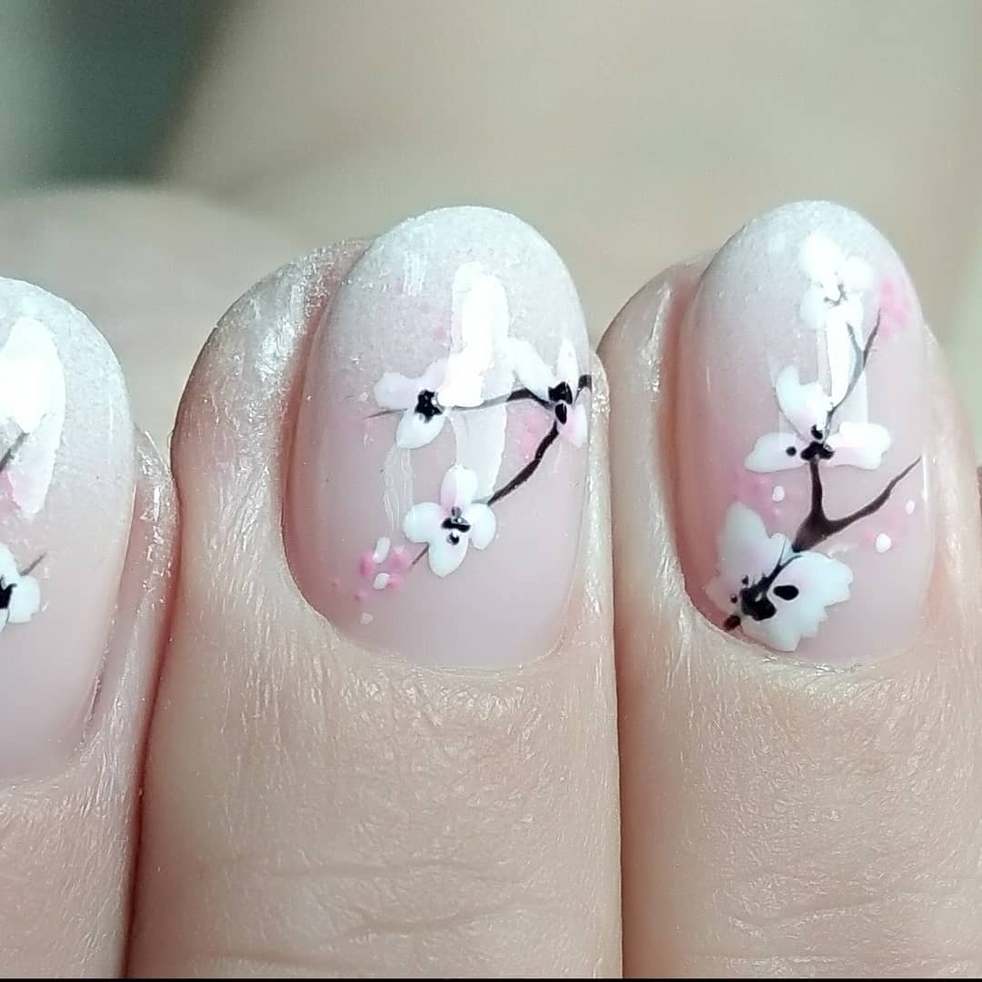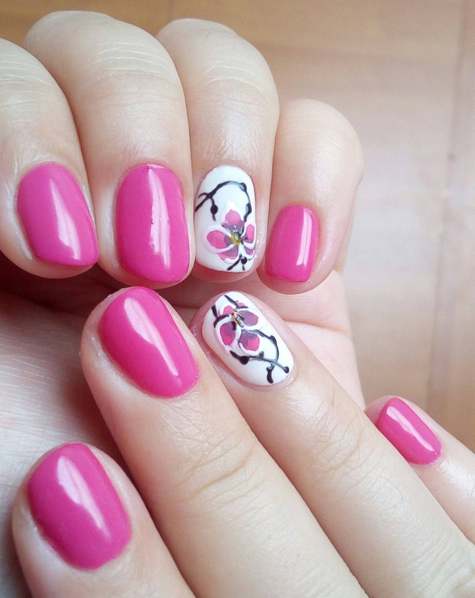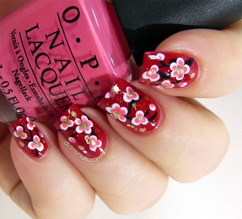 Les amateurs de manucure à la maison devraient commencer par cette option. Vous devez d’abord appliquer une couche monophonique sur tous les ongles et attendre qu’elle sèche complètement. Ensuite, appliquez les branches avec un pinceau fin et de la peinture noire. Veuillez noter qu'il est préférable que le motif ne soit placé que sur quelques ongles. Avec un pinceau légèrement plus large et de la peinture rose, appliquez l’image de fleurs sur les branches. Si vous le souhaitez, le milieu de chaque bouton peut être marqué d'une nuance légèrement plus foncée.